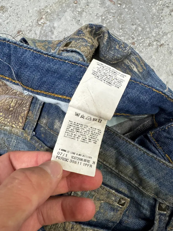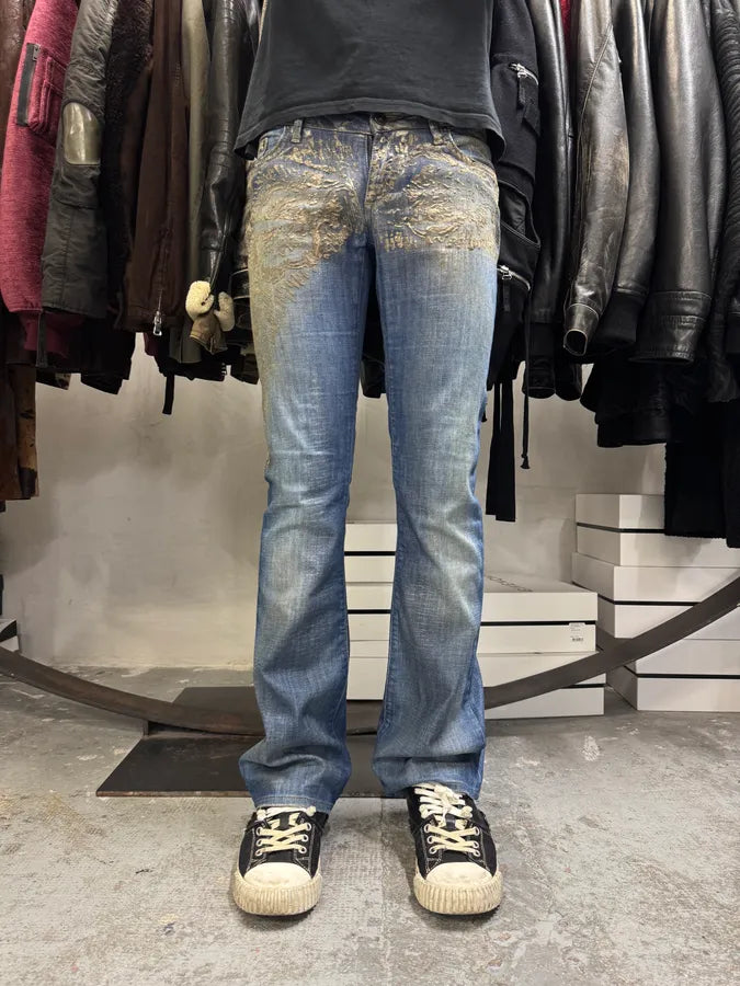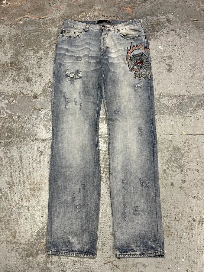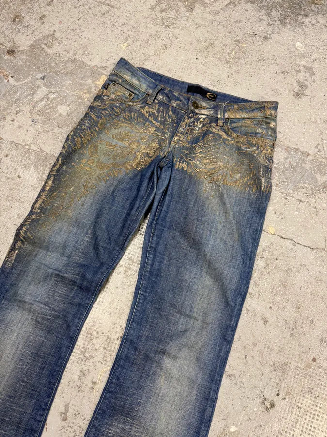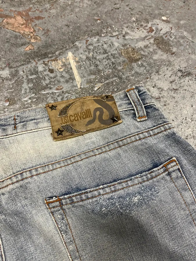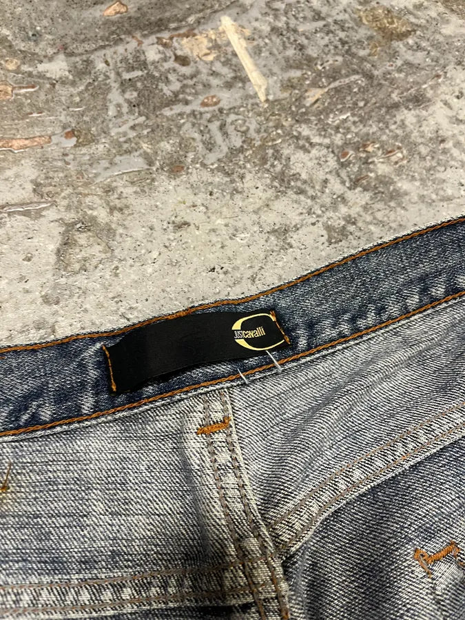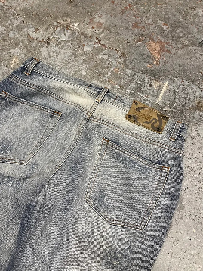 2000s Cavalli Blue World Eroded Denim Jeans