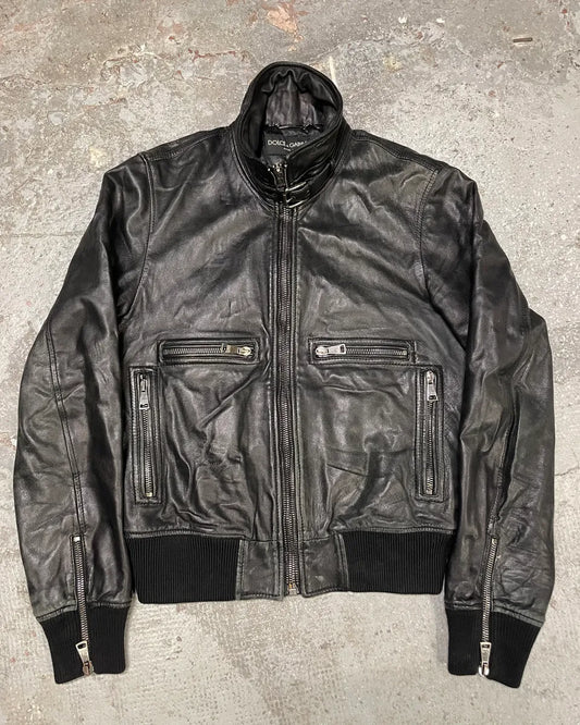 2010s Dolce & Gabbana Black Premium Lamb Leather Bomber Jacket -