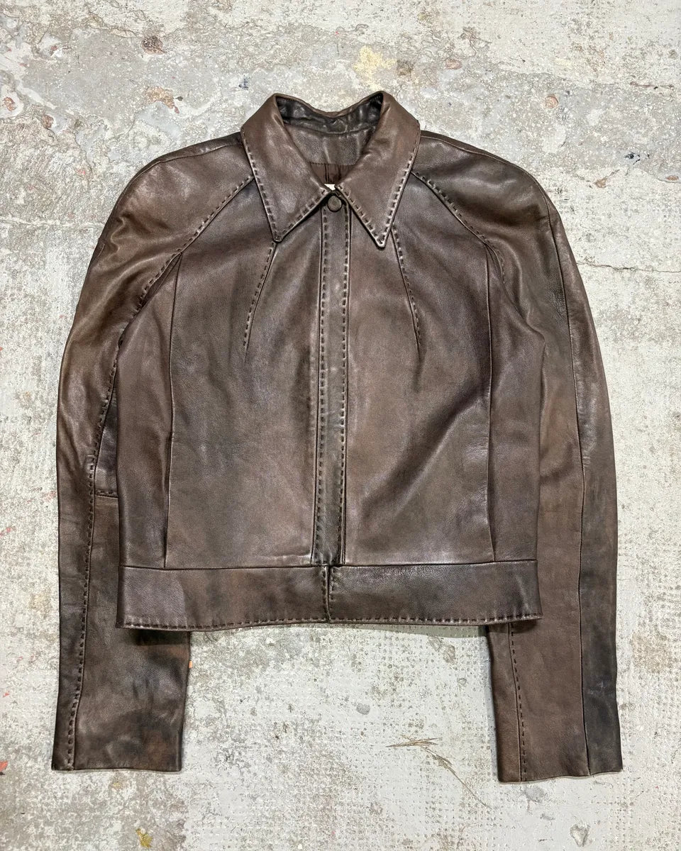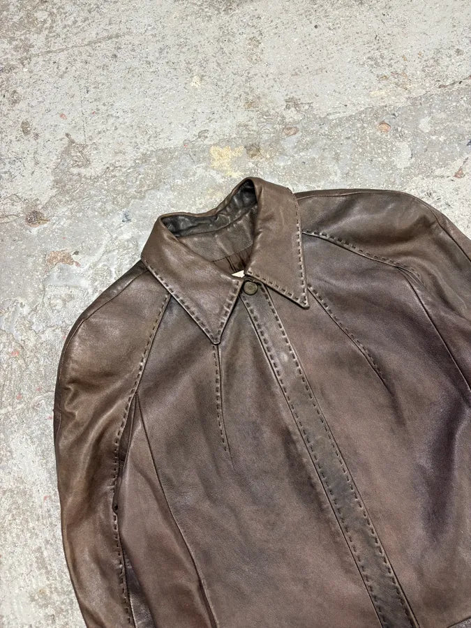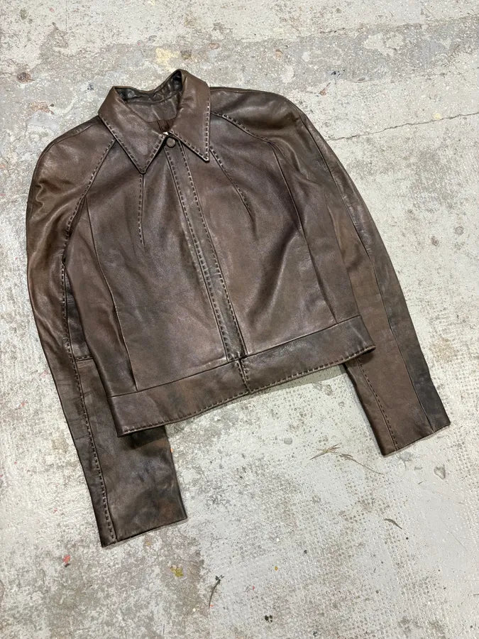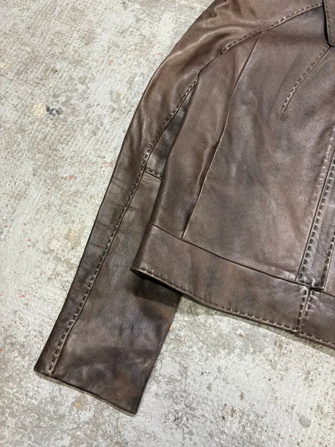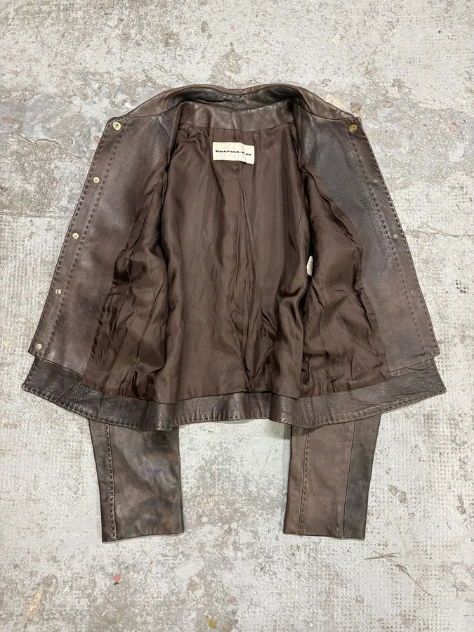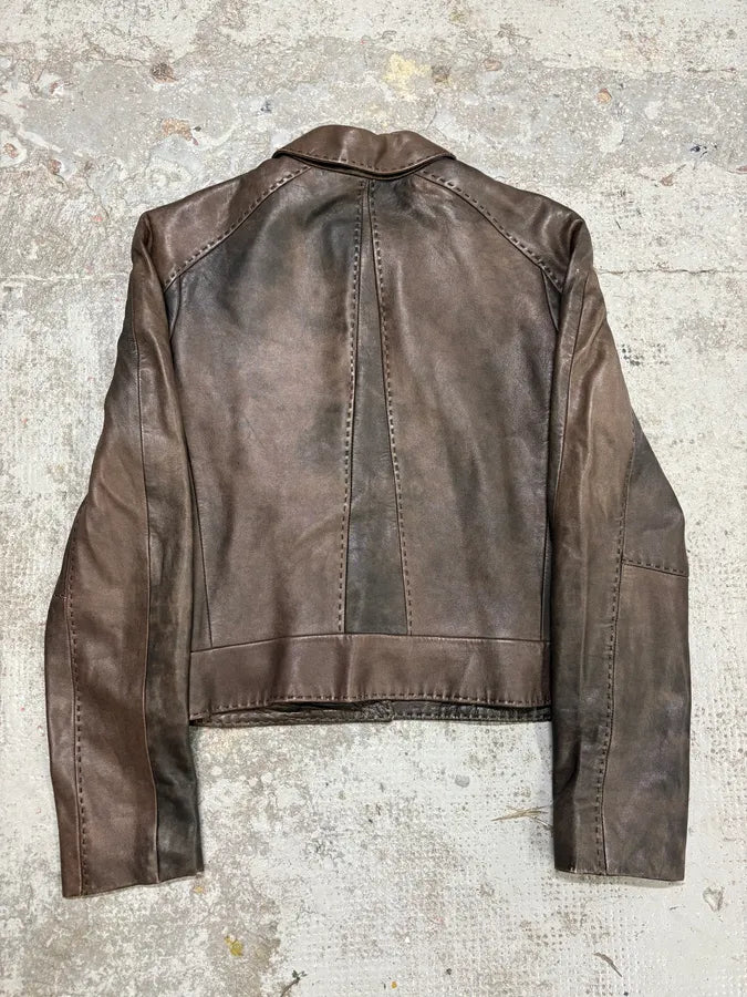 2000s Eroded Brown Archive Leather Jacket with Detachable Sleeves -