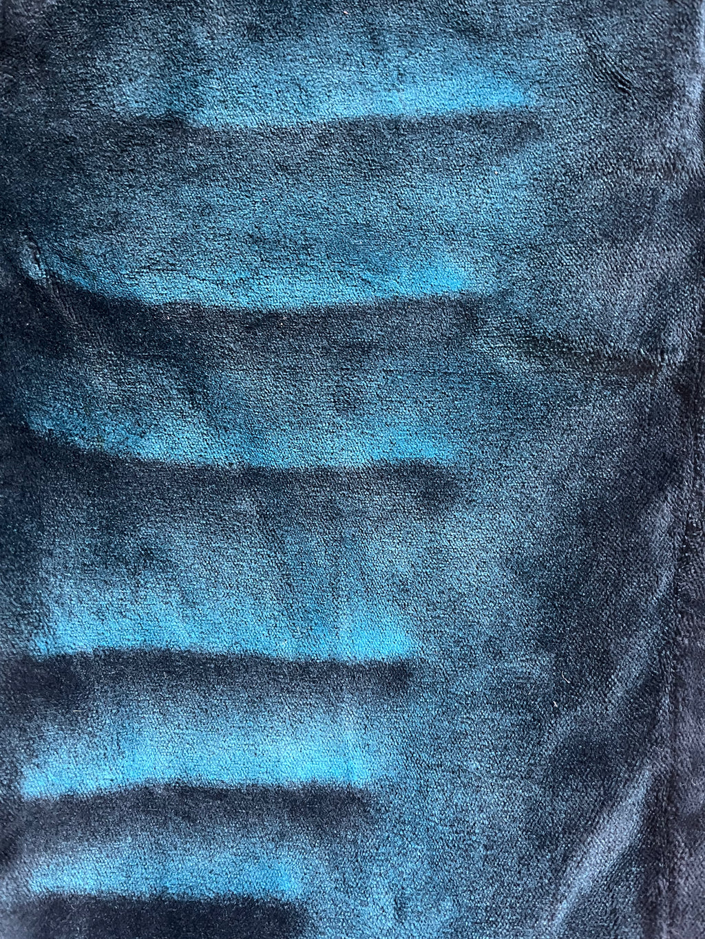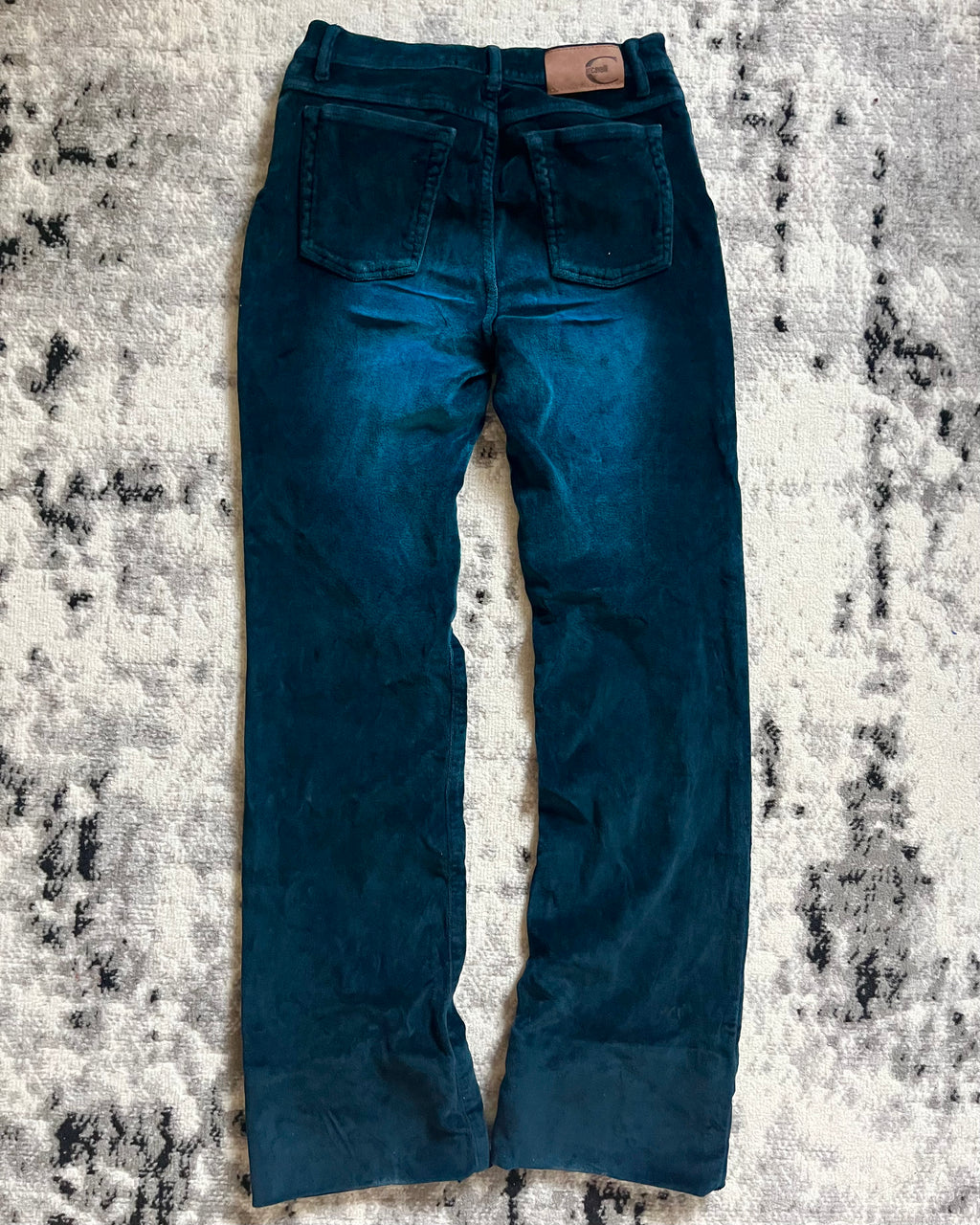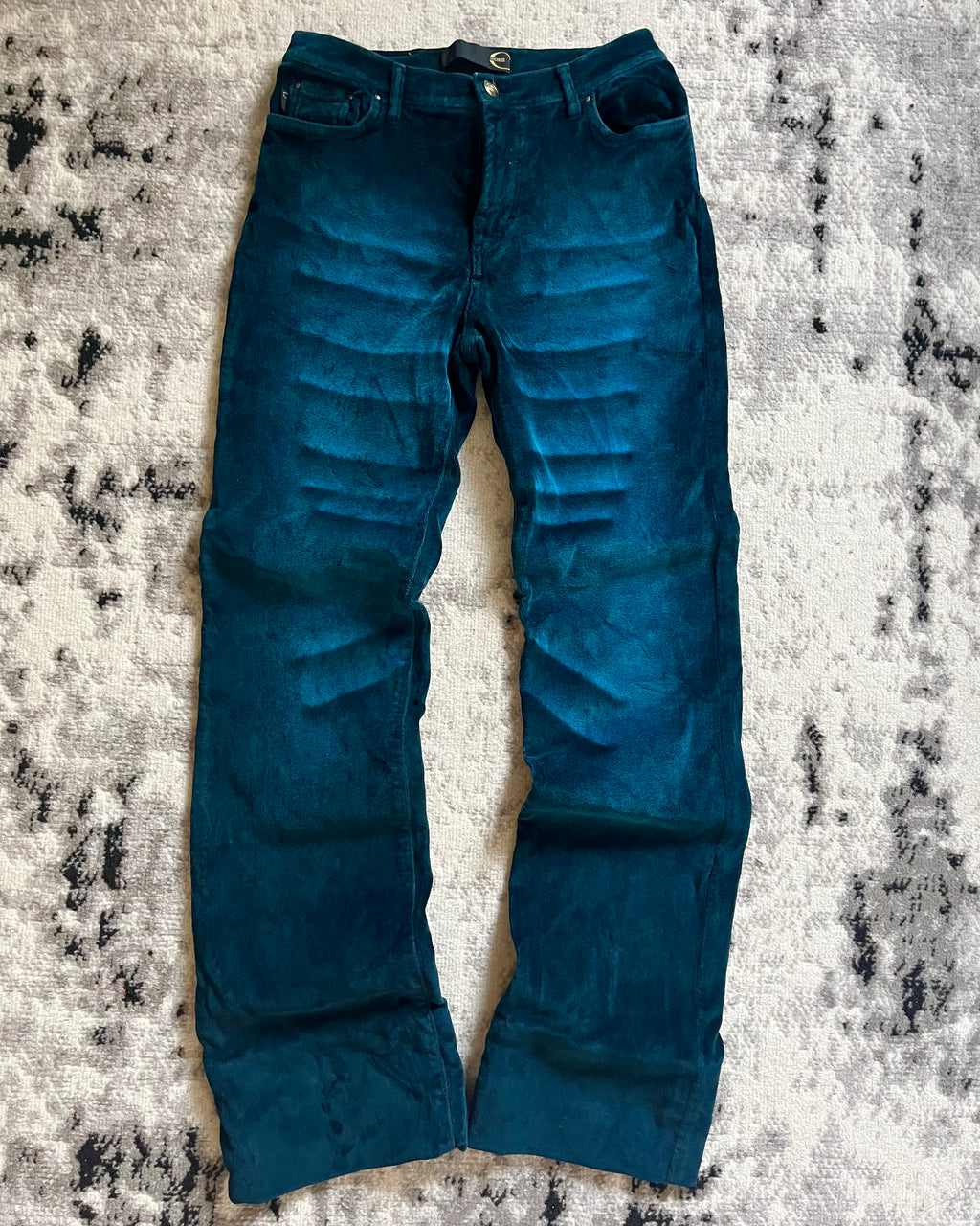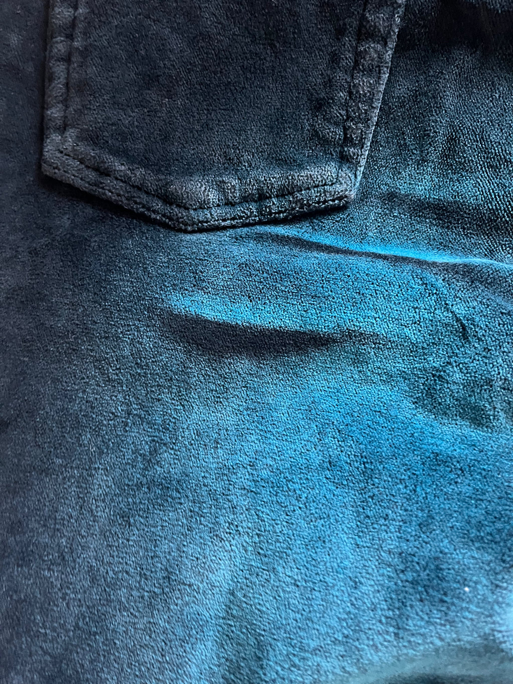 Crafted from the finest blue velvet fabric, these pants exude luxury and elegance. The plush texture not only looks decadent but also feels indulgent against the skin. The upper part of the pants features captivating turquoise accents, creating a visually striking contrast against the deep blue velvet. Please refer to measurements Waist - 33,5cm Length - 99,5cm Leg Opening - 20,5cm Still in good general condition (hems were made by a professional, and are not visible from the outside)