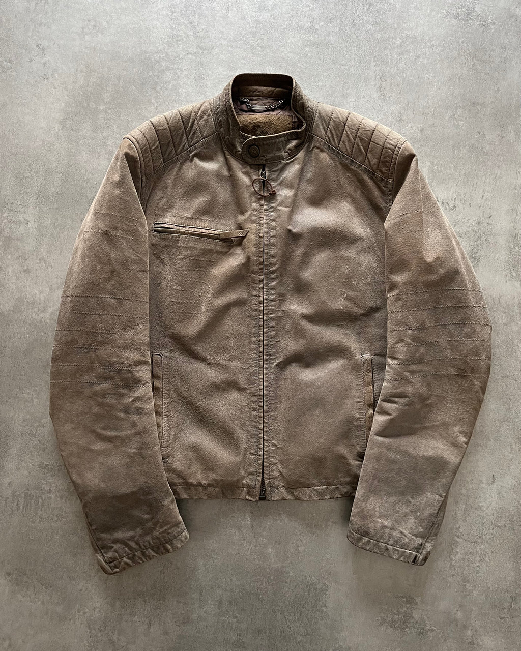 This jacket is one of our favorites from our collection, as it perfectly represents the minimalist, charismatic look of the Italian leather jacket of the period. The details on the front, on the shoulders, all the seams at the elbow, the color of the jacket, all make it a timeless and unique collector's item. Still in a great overall condition. Marked as size 50 (M): Length - 65cm / Sleeves - 65cm / Shoulders - 46cm