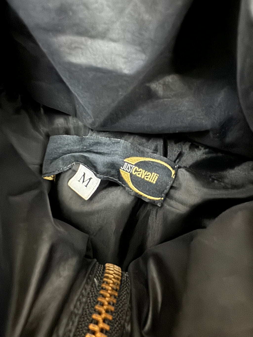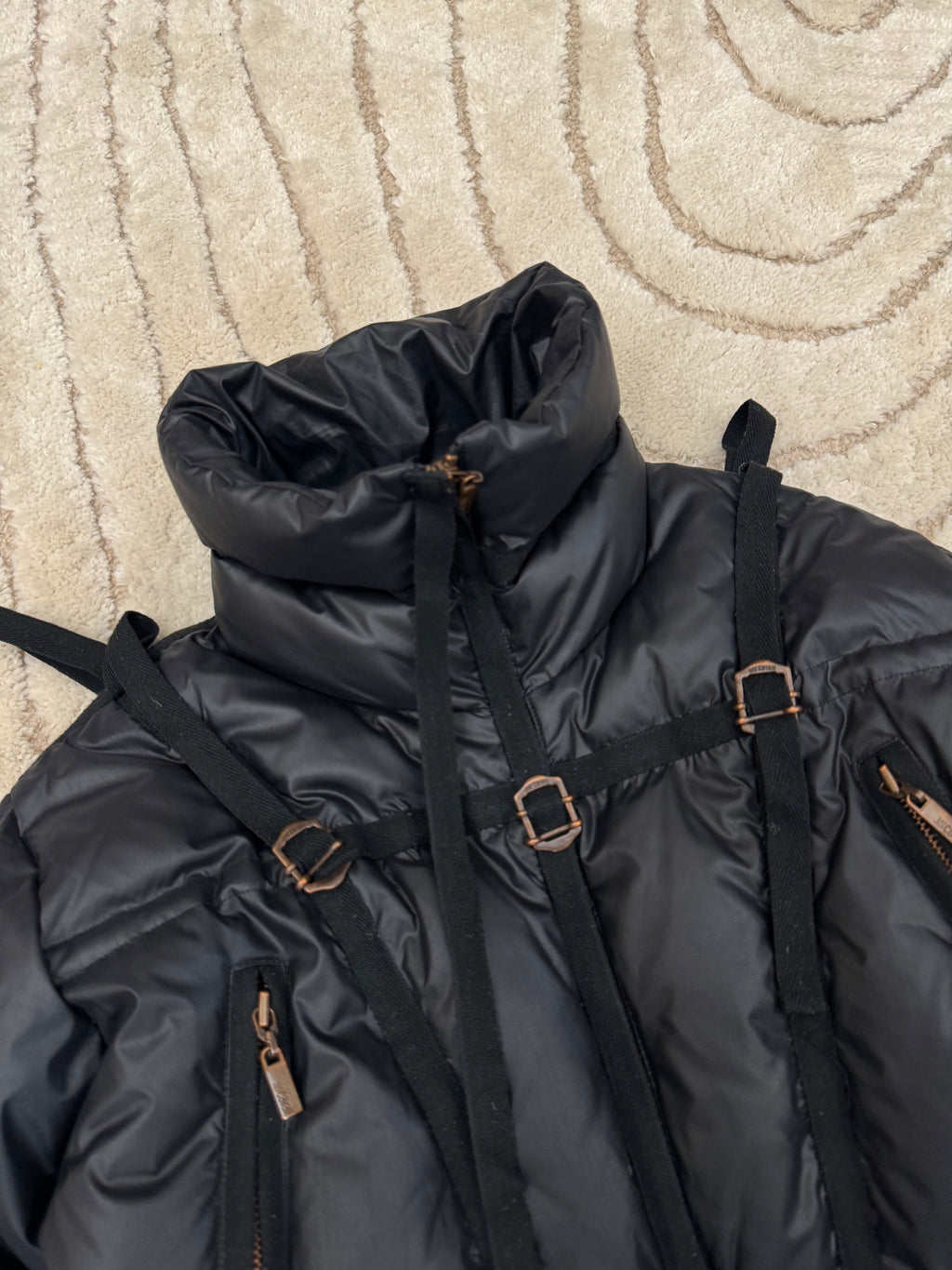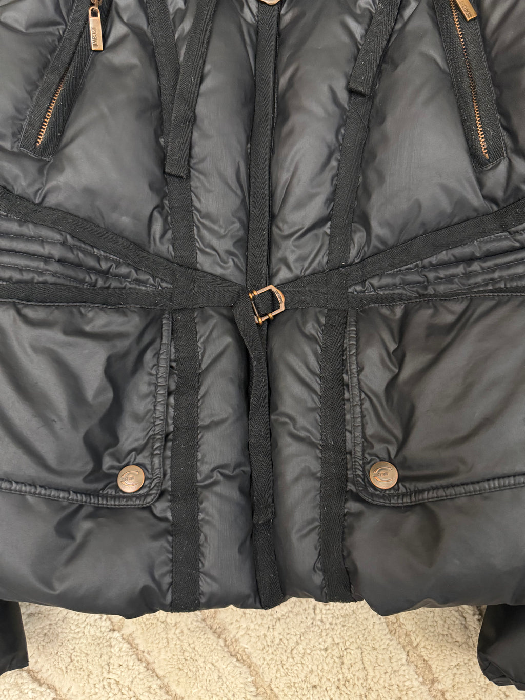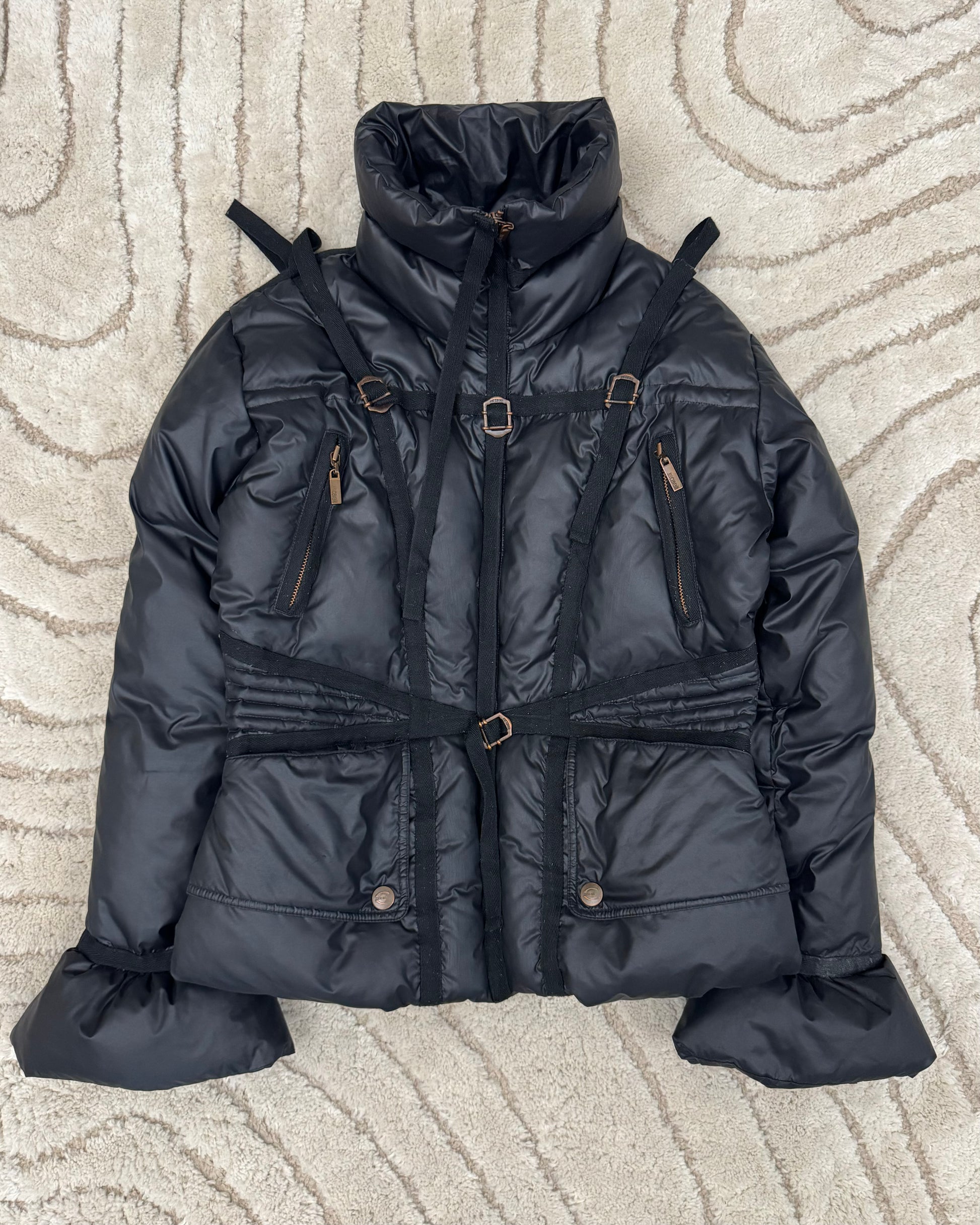 Iconic Cavalli parachute puffer jacket with several straps.