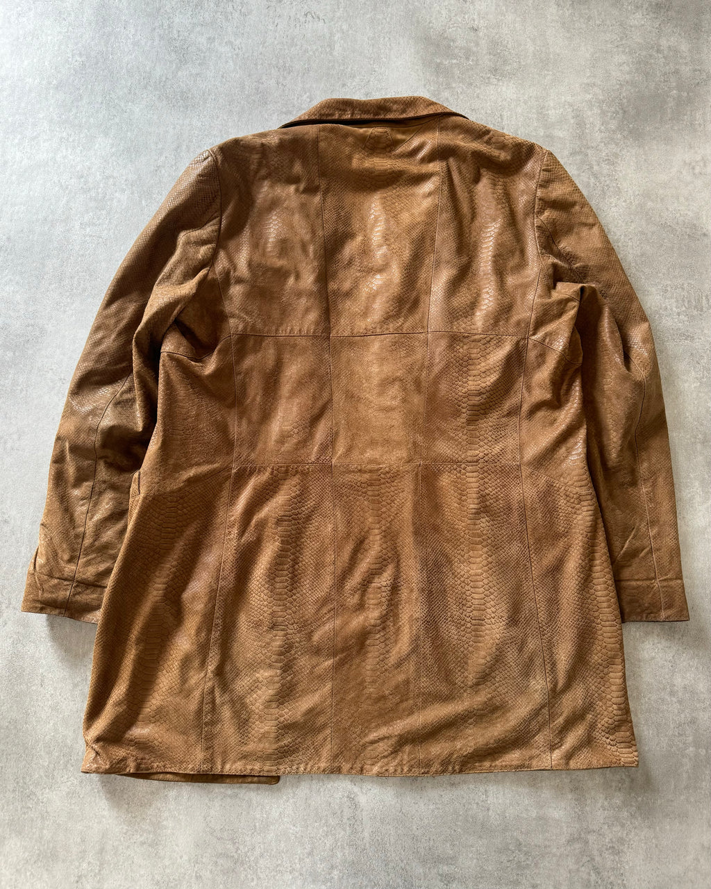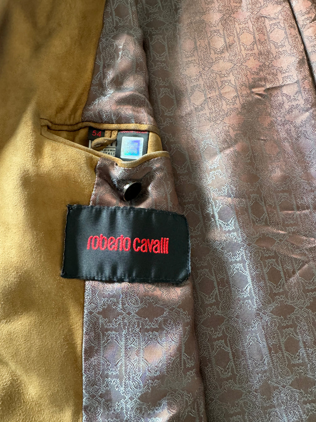 The 1990s Roberto Cavalli Camel Genuine Long Leather Jacket is a true embodiment of timeless elegance and luxury craftsmanship. Crafted from premium camel-colored leather, this exquisite jacket exudes sophistication and refinement. With its long silhouette, this jacket offers both style and functionality, providing ample coverage and warmth during the cooler months. The rich camel hue adds a touch of warmth and sophistication, making it a versatile piece that pairs effortlessly with any outfit. That's a rare collector item, really hard to find. The leather is still beautiful, despite some small signs of use. There are small traces, visible in the photos, but very few when worn. Marked as size 54 (Large).
