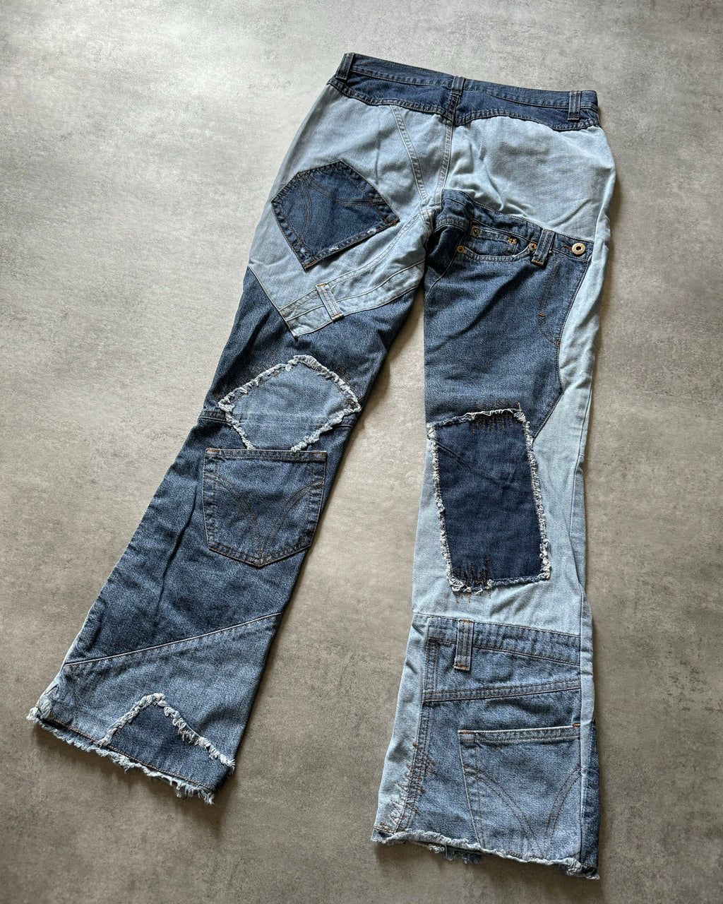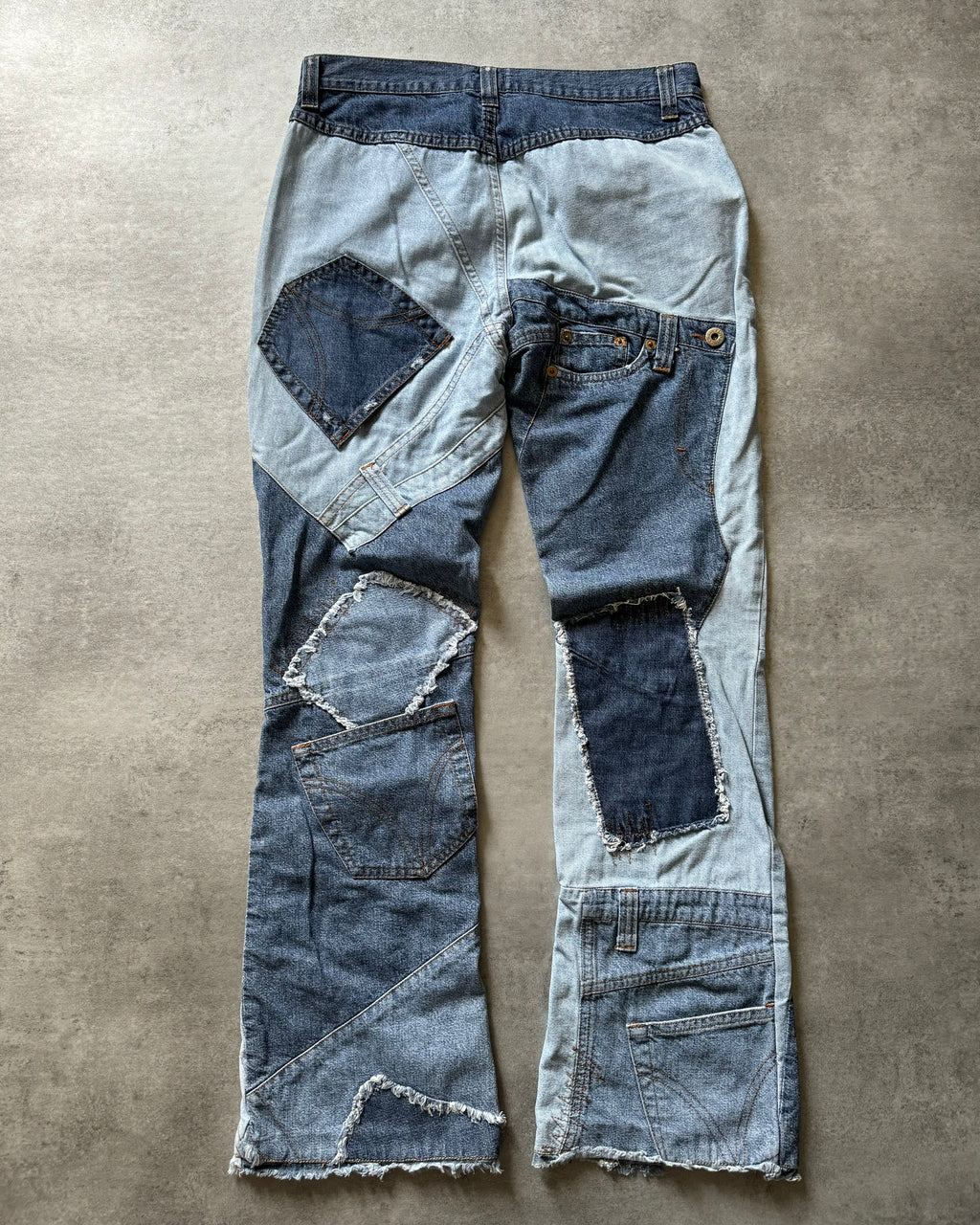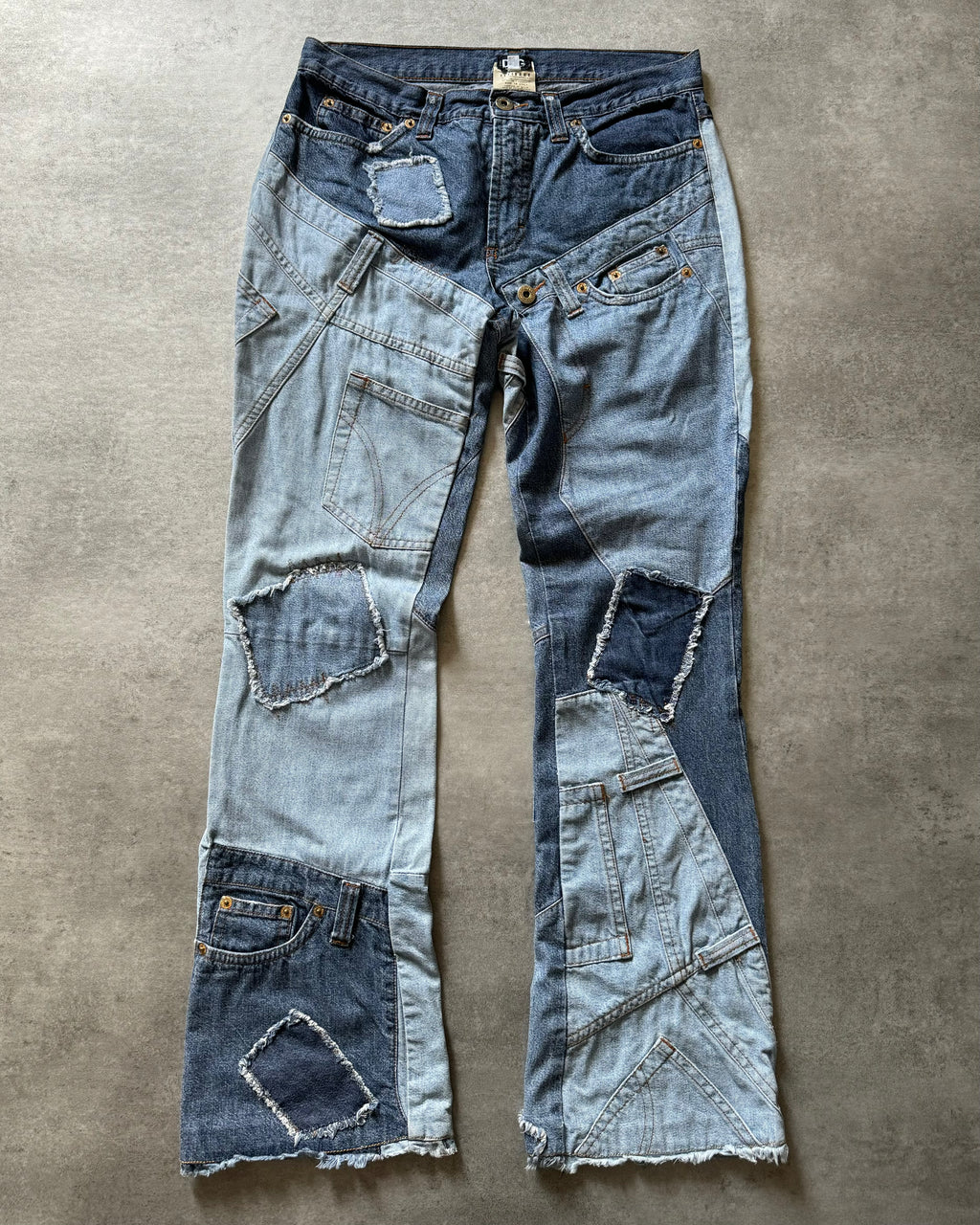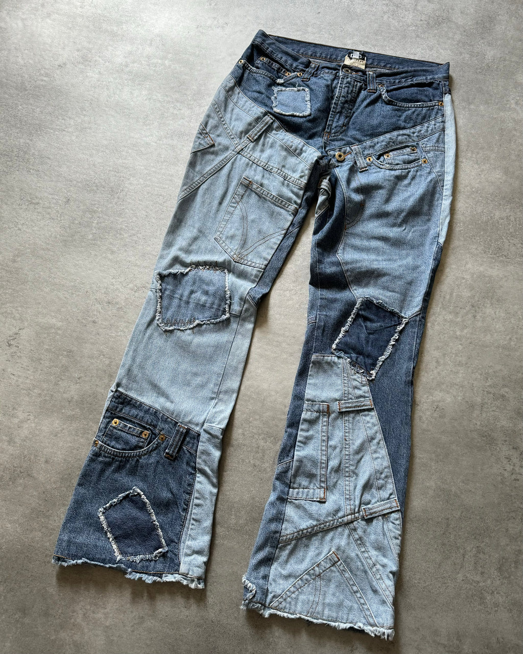 Featuring a patchwork construction with a variety of washes and textures, these jeans exude a sense of individuality and sophistication. Each patch tells a story, creating a unique and eye-catching aesthetic that sets these jeans apart from the rest. The elevated silhouette and tailored fit offer a modern twist on classic denim, ensuring a flattering and comfortable wear. Whether paired with a crisp white shirt for a refined look or styled with a graphic tee for a more casual vibe, these jeans add a touch of high-fashion flair to any ensemble. Still in a great overall condition