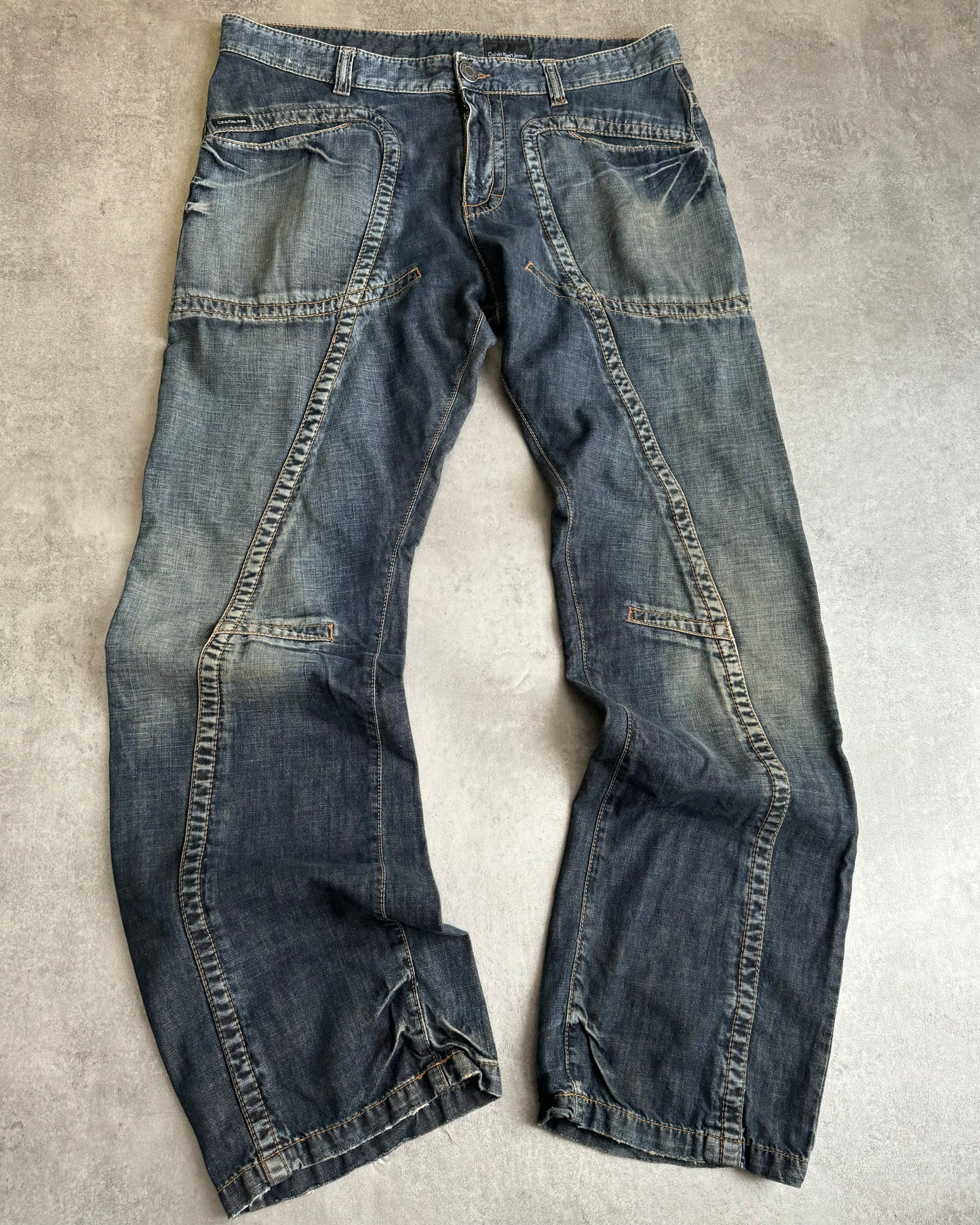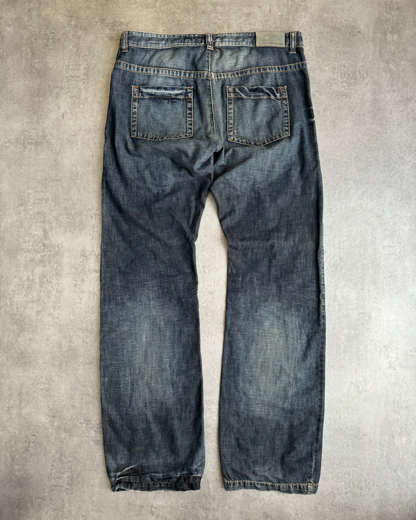 These jeans are characterized by their cool and laid-back straight relaxed cut, offering both fashion and comfort. The faded blue wash adds a touch of vintage-inspired charm, making them a versatile choice for various occasions. What sets these jeans apart is the meticulous attention to detail in the form of seams that adorn the entire garment. These seams create a unique visual texture. Still in a great overall condition.