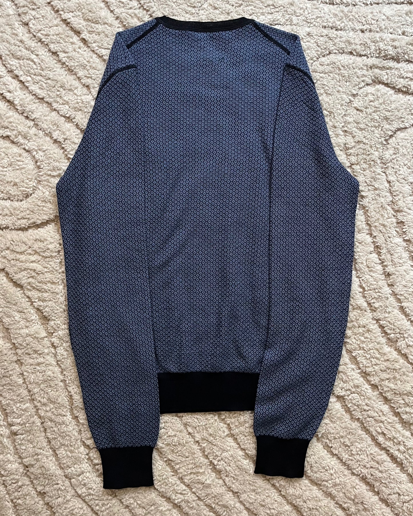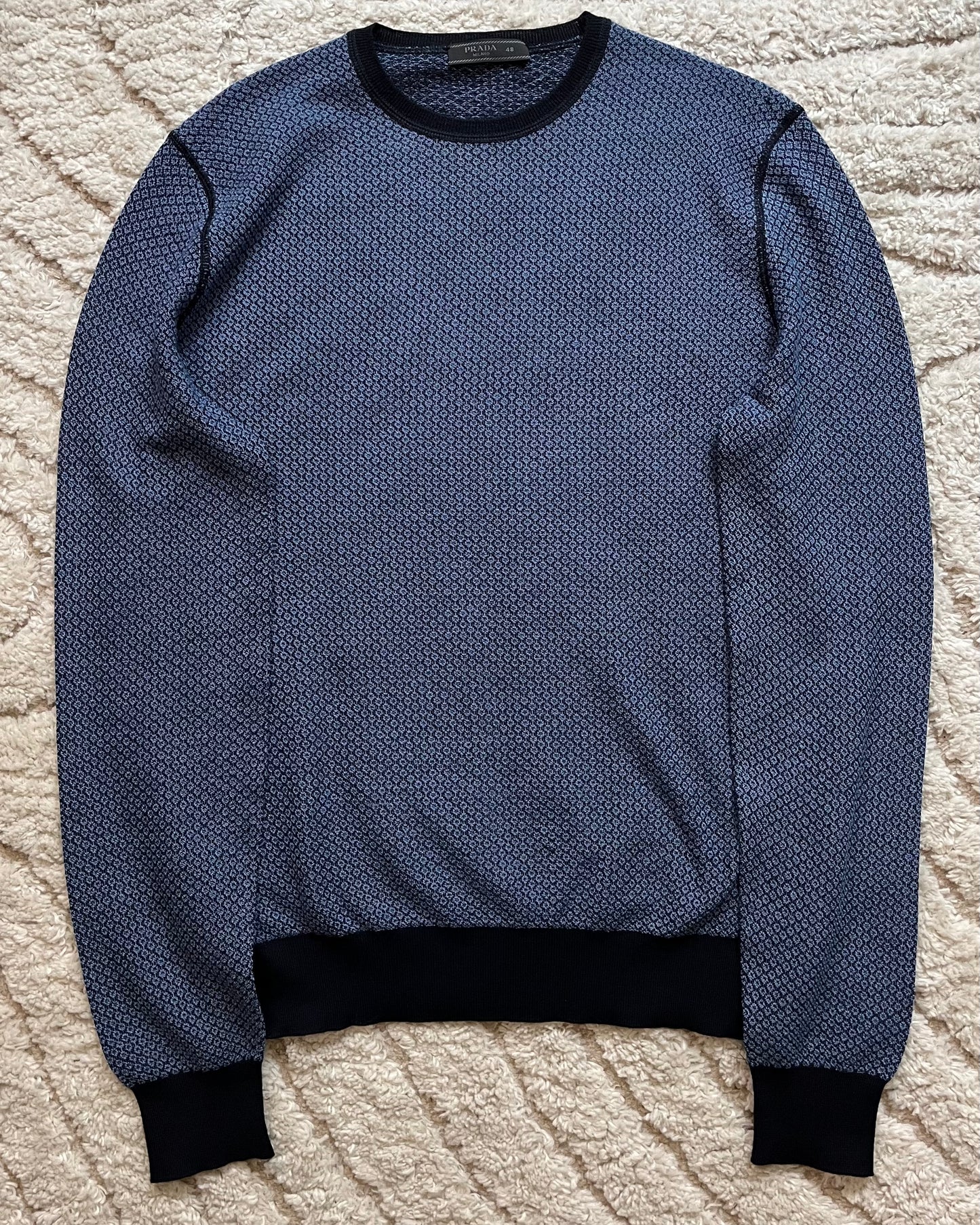 The sweater features a sophisticated color combination of blue and black, adding a touch of elegance to your ensemble. Prada's signature craftsmanship is evident in the impeccable stitching and attention to detail, reflecting the brand's commitment to timeless quality.