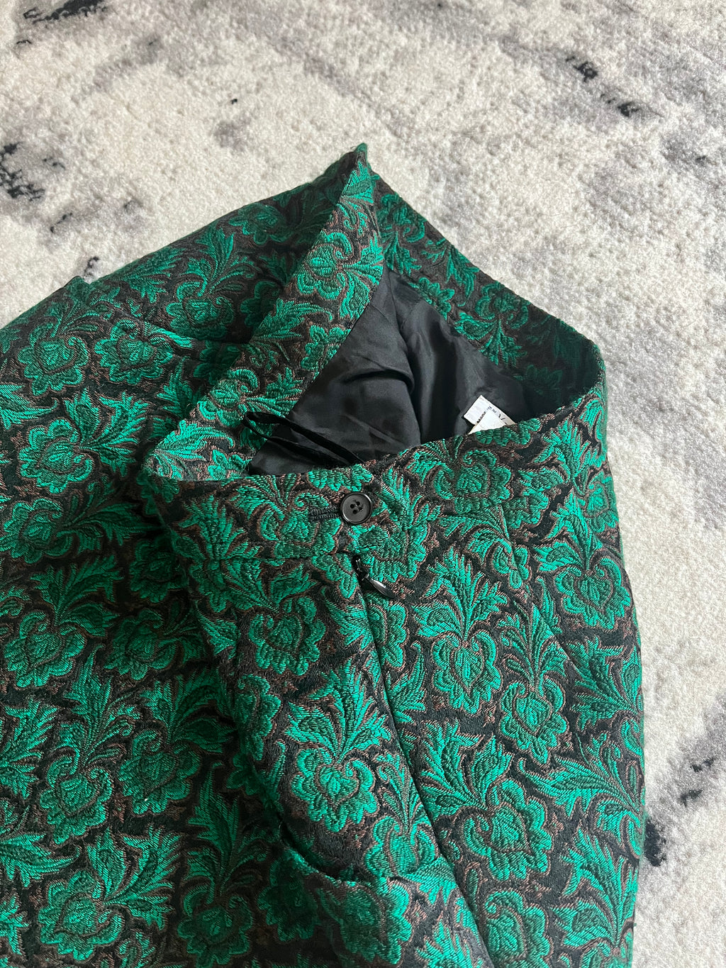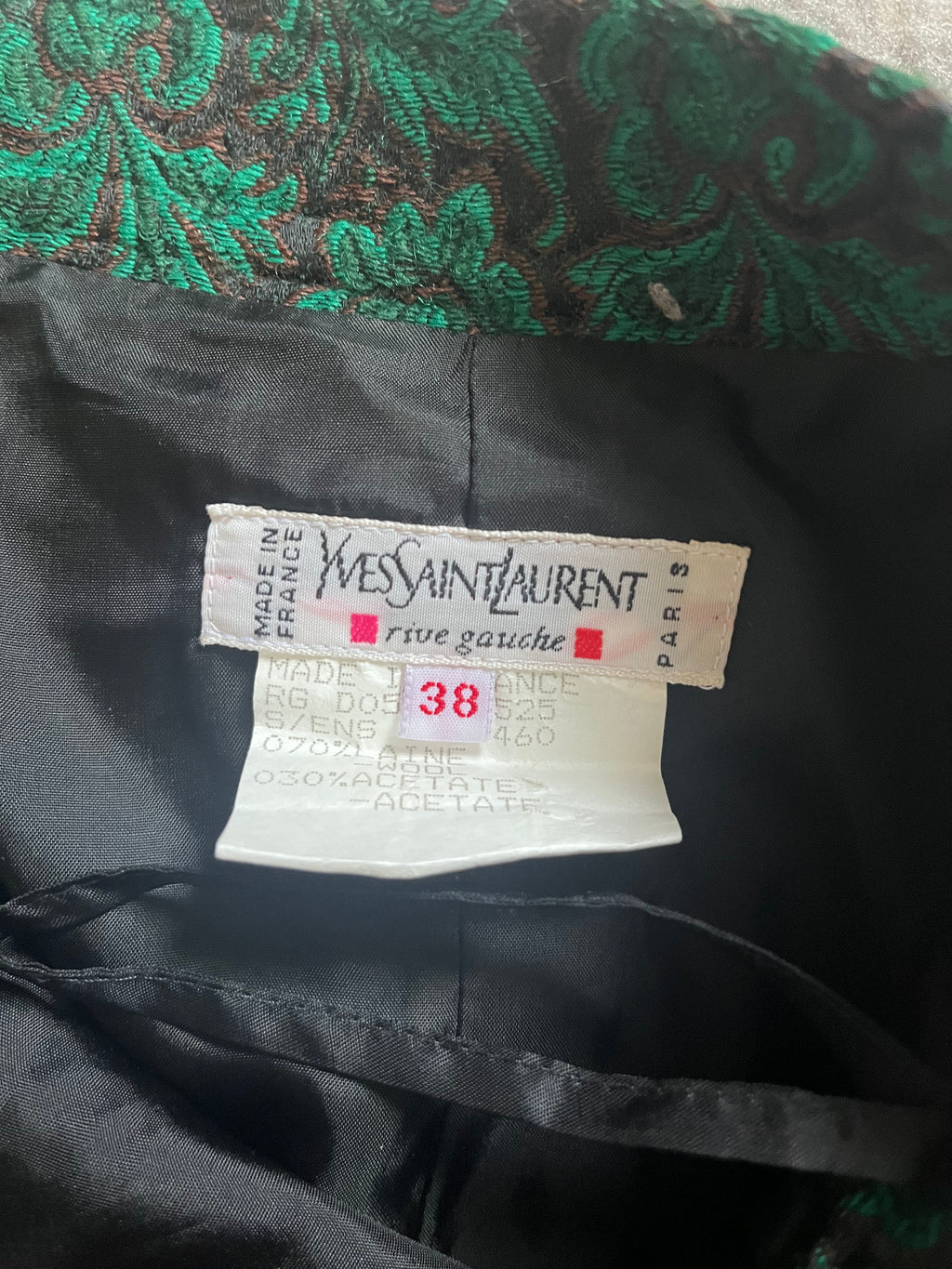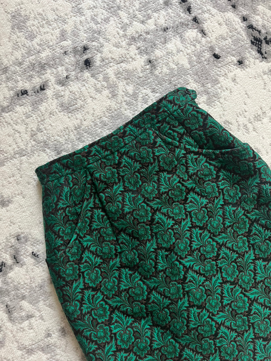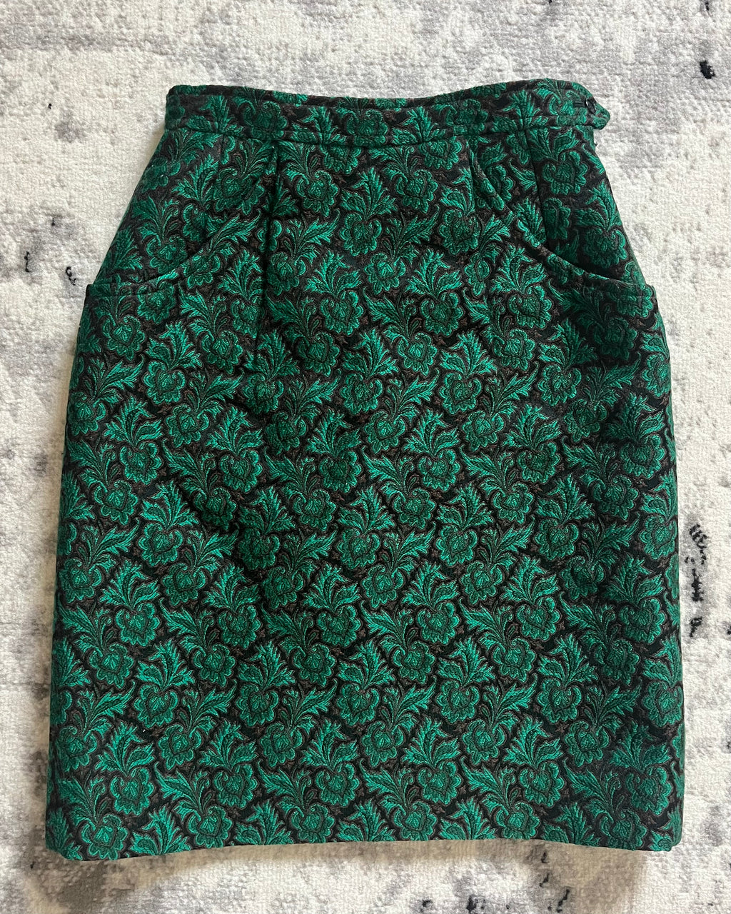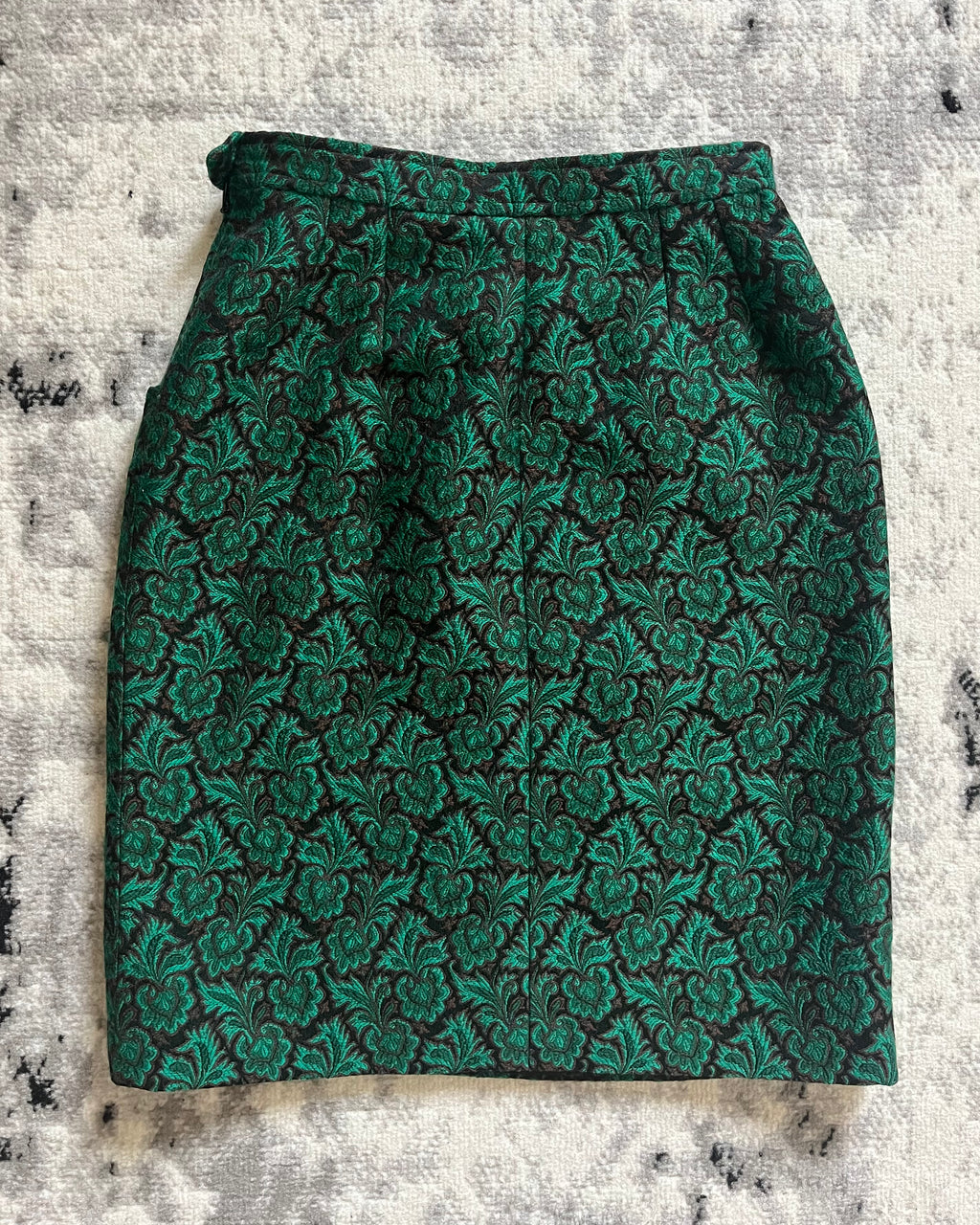 The 'Saint Laurent Rive Gauche Green Wool Skirt' is a sartorial gem, encapsulating the timeless elegance of the 80s. Crafted with precision in France, this skirt from the esteemed Rive Gauche collection by Saint Laurent is a testament to enduring style and craftsmanship. The enchanting green and black combo, adorned with relief flowers, adds a touch of vintage sophistication to your wardrobe.