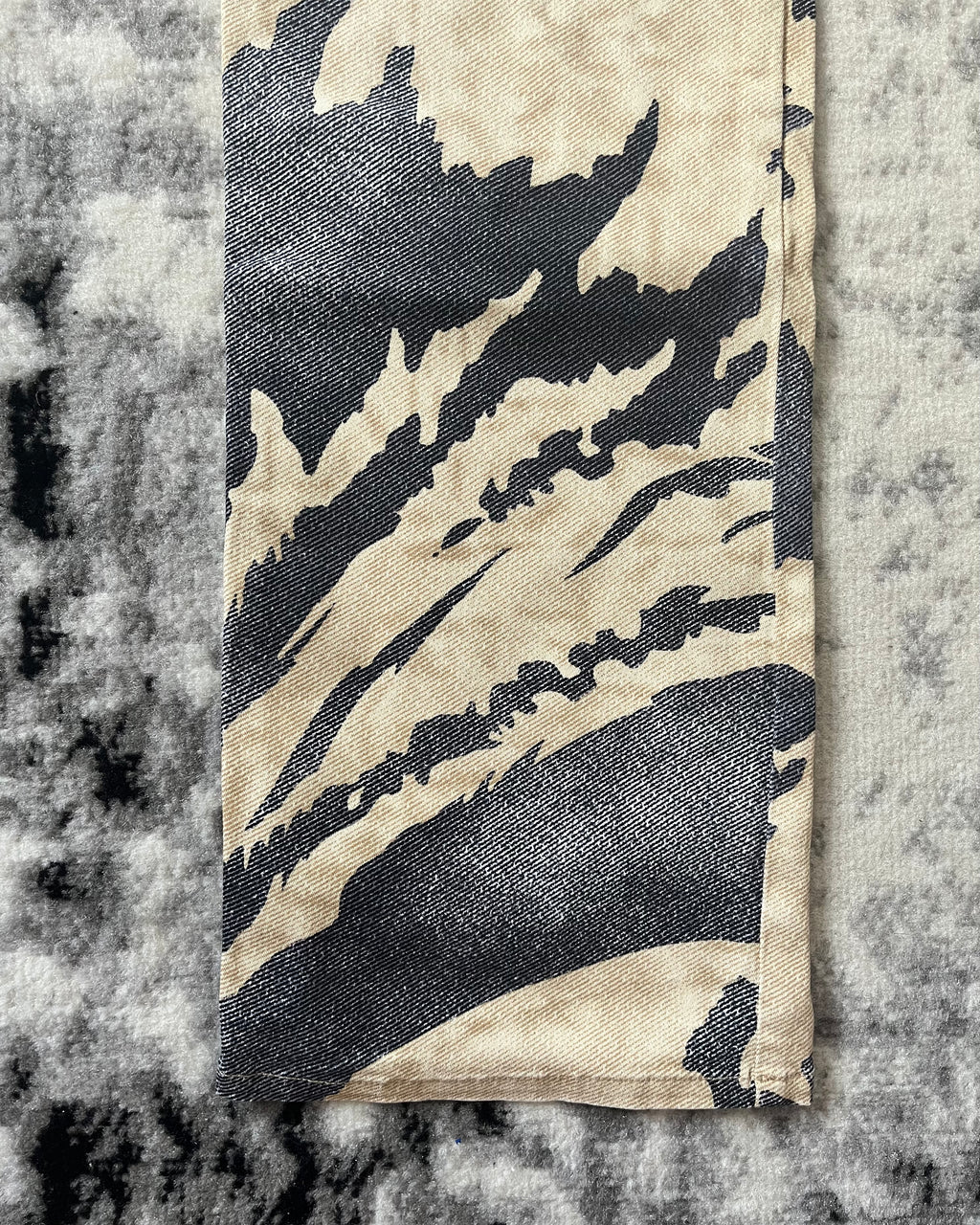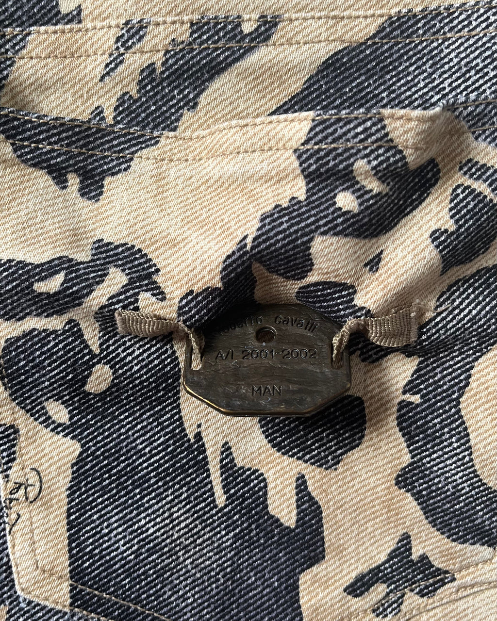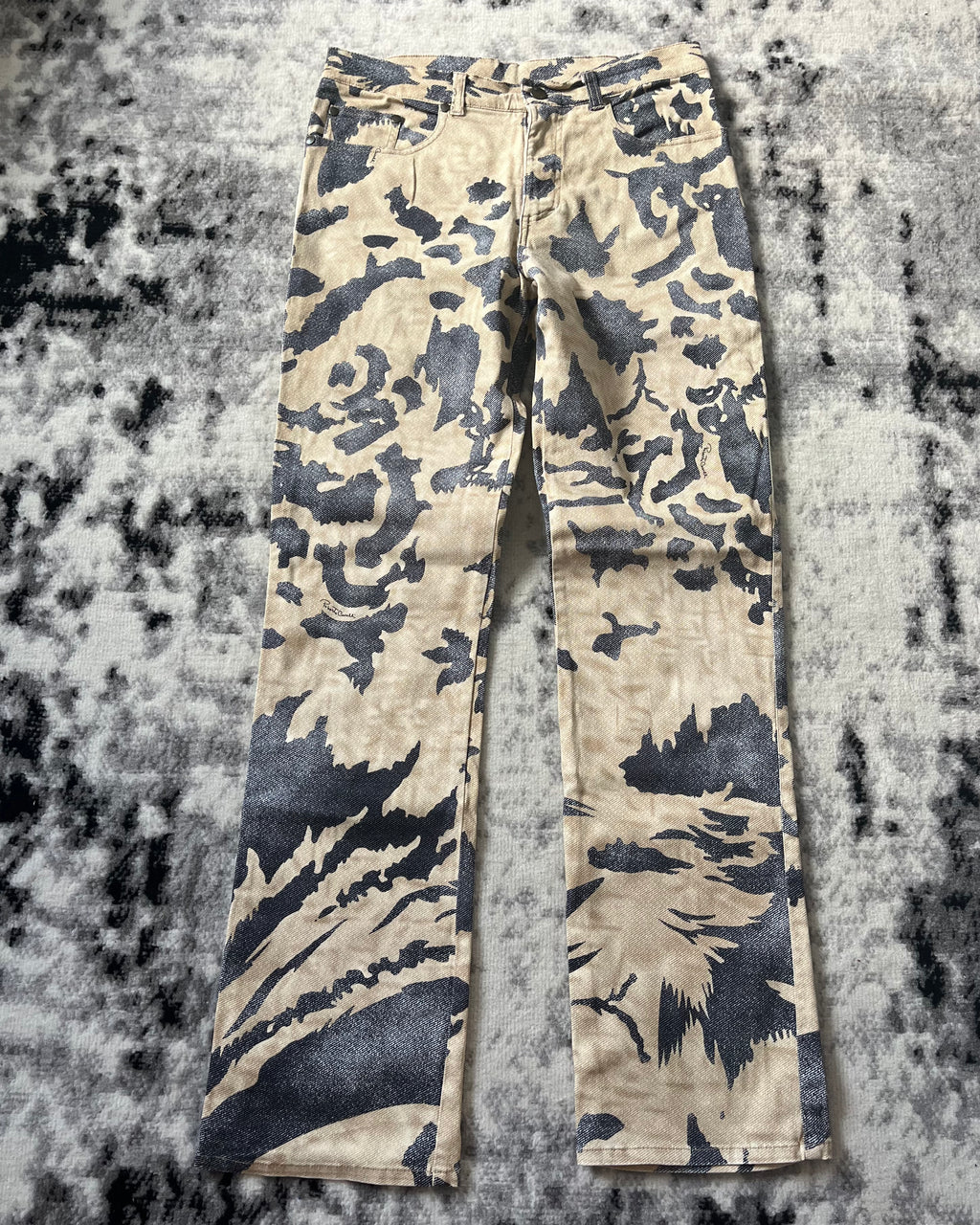 Crafted with meticulous attention to detail, these pants boast intricately designed blue motifs that gracefully adorn the beige fabric. The artful arrangement adds a touch of sophistication and visual intrigue, making them a standout addition to your wardrobe. With a flattering fit and premium fabric, these pants ensure both style and comfort. Whether you're attending a formal gathering or expressing your individuality in daily life, these pants effortlessly elevate your look with their unique charm. Cavalli's legacy in the fashion industry is deeply rooted in their appreciation for artistry and timeless aesthetics. These Beige Pants with Blue Motifs reflect their ability to create clothing that exudes luxury while embracing the spirit of refined elegance. The shirt of the same collection is also available for sale. Please refer to measurements Outseam - 104cm Waist - 39,5cm Leg Opening - 20cm Thigh - 23,5cm