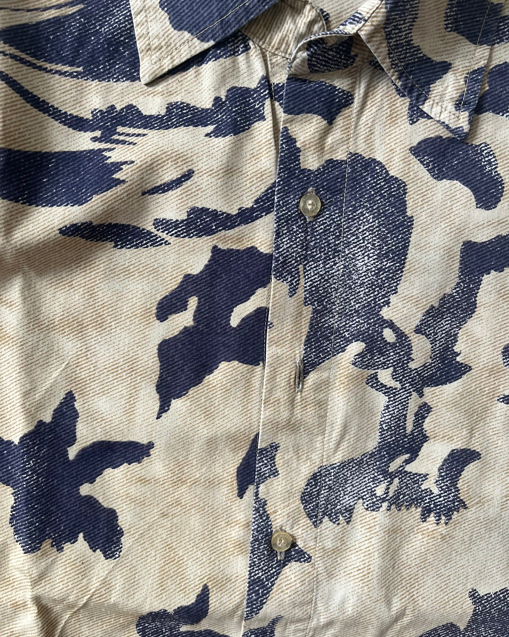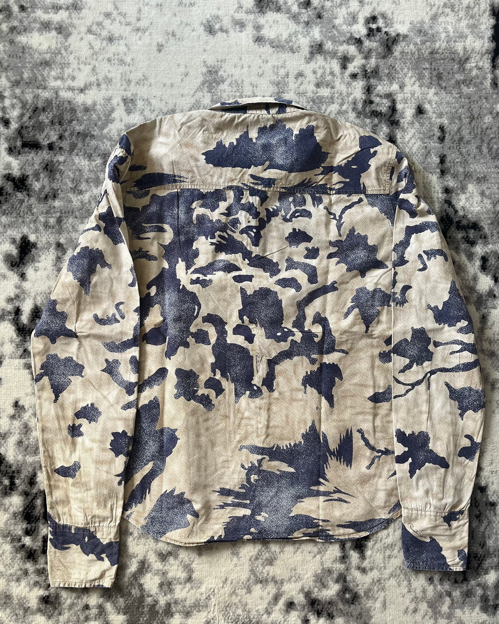 Crafted with meticulous attention to detail, this shirt boast intricately designed blue motifs that gracefully adorn the beige fabric. The artful arrangement adds a touch of sophistication and visual intrigue, making them a standout addition to your wardrobe.