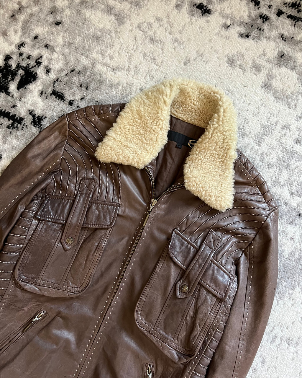 Step into the world of Italian fashion with this exquisite Just Cavalli Brown Leather Jacket. With its unique Monmouth collar, stunning design, and iconic Italian DNA, this jacket is a true work of art. The brown color of this jacket exudes timeless elegance and versatility. It's a hue that complements a wide range of outfits, making it a valuable addition to your wardrobe. The two large frontal pockets not only contribute to the jacket's design but also provide practicality. They offer ample storage space while maintaining a sleek aesthetic. Just Cavalli is celebrated for its creative and artistic designs, and this jacket reflects the brand's commitment to fashion as a form of personal expression and art. Still in great condition. Marked as size L but could also fit a Medium. Please refer to measurements: Length - 69cm, Shoulder to shoulder - 47cm, Sleeves length - 67cm