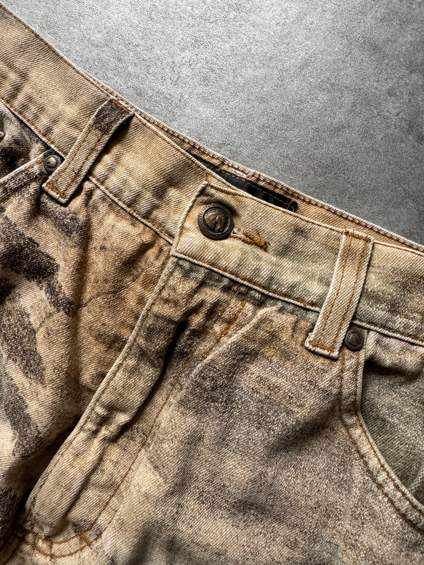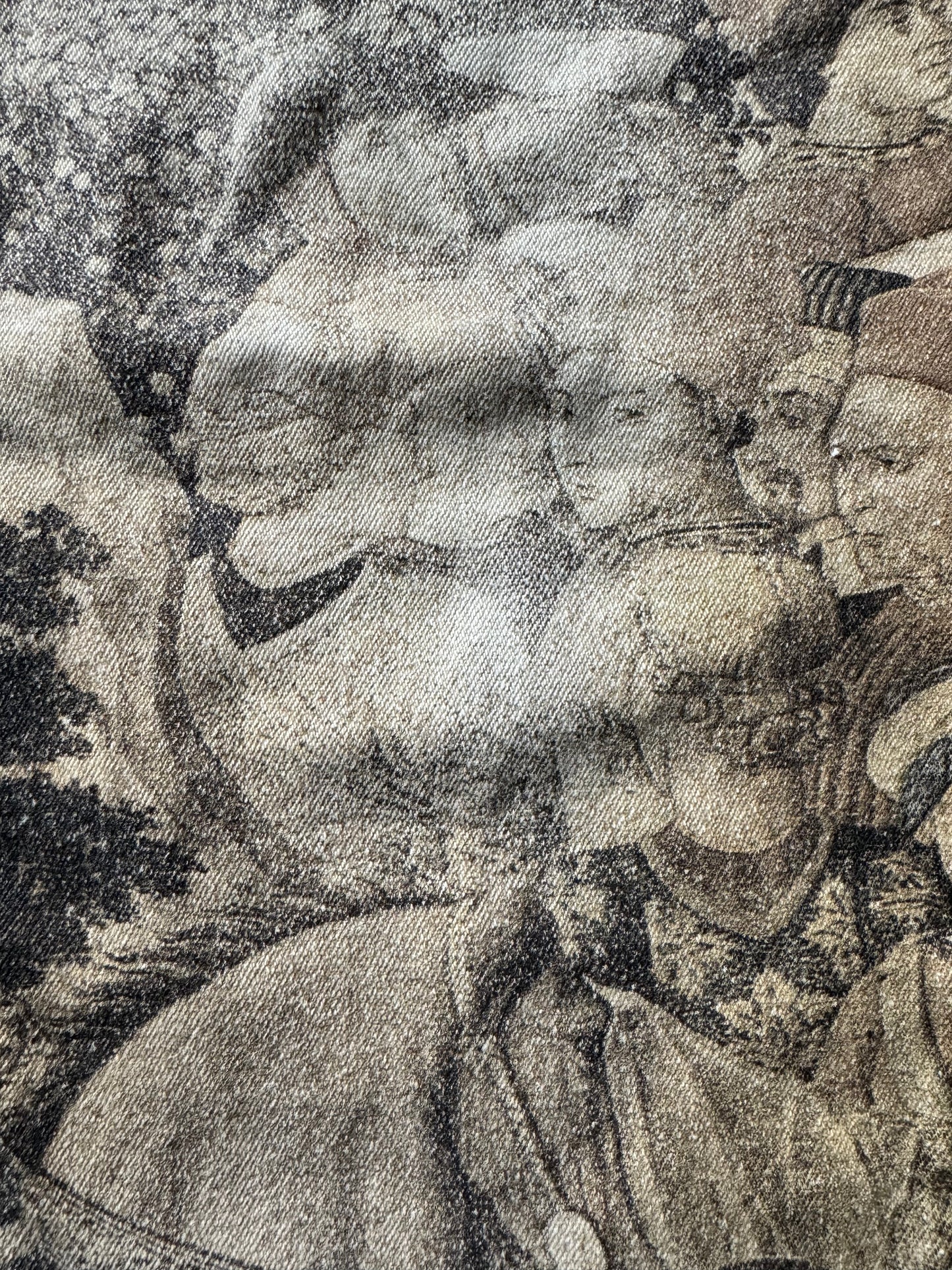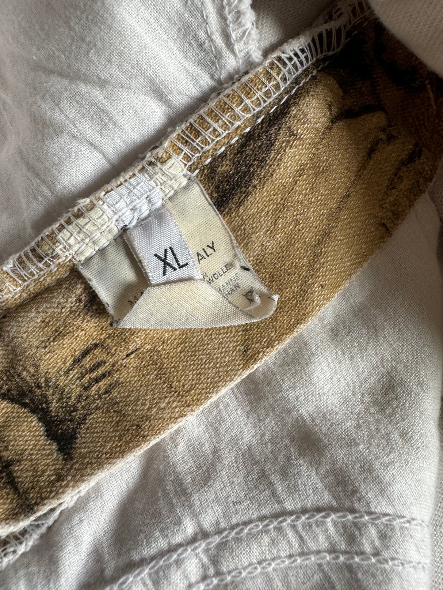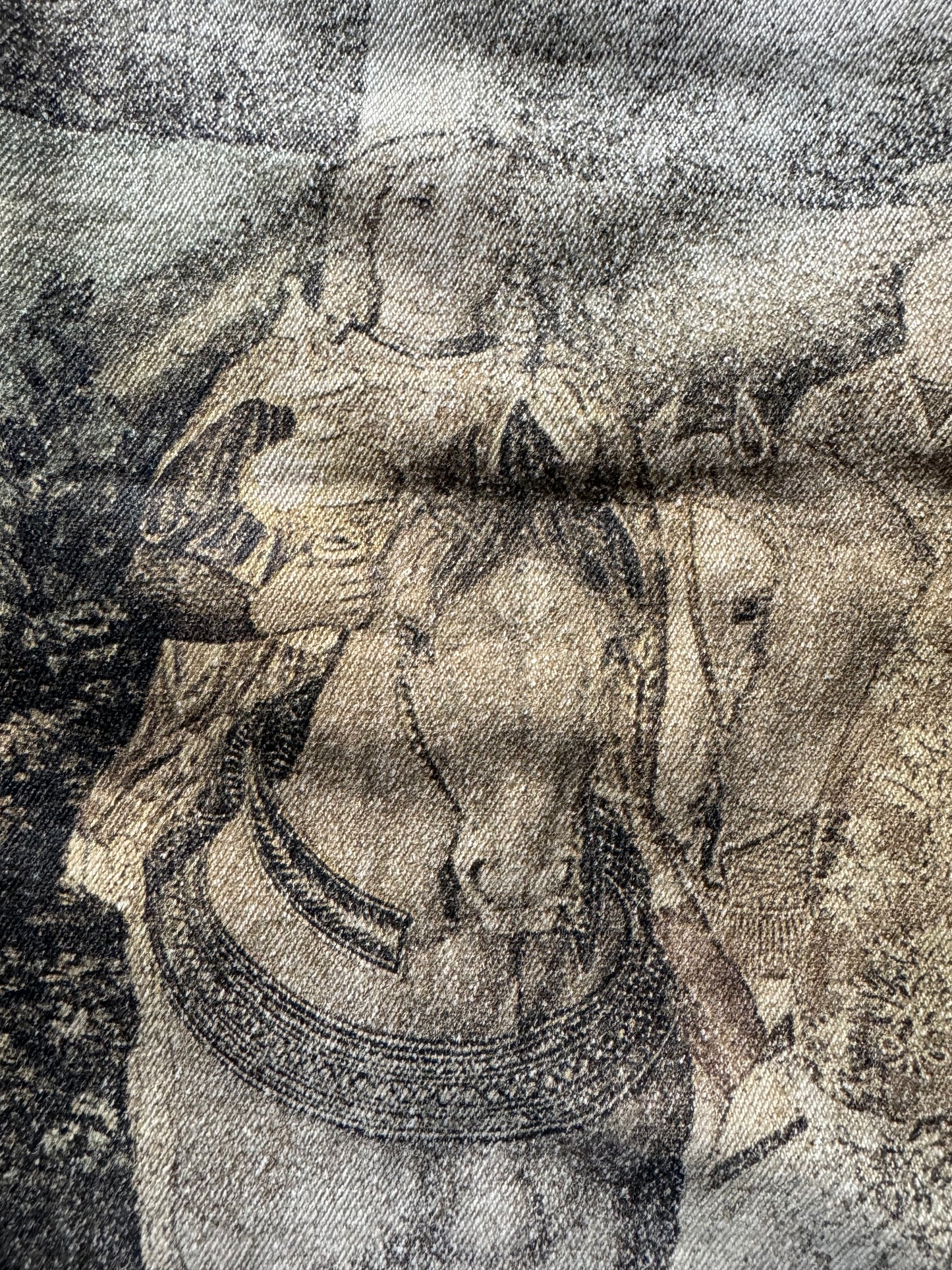 AW1995 Roberto Cavalli Medieval Art Renaissance Print Pants. These pants feature a mesmerizing Renaissance print inspired by medieval art, showcasing intricate patterns and vibrant colors that evoke a sense of opulence and sophistication. Those pants are a coveted addition to any wardrobe: a rare find that encapsulates Cavalli's visionary approach to design and craftsmanship. Still in good overall condition, the wear and tear of the print adds a great deal of charm. Size XL women/ M men