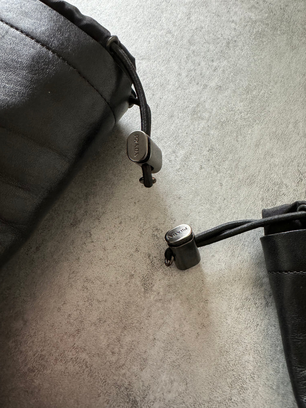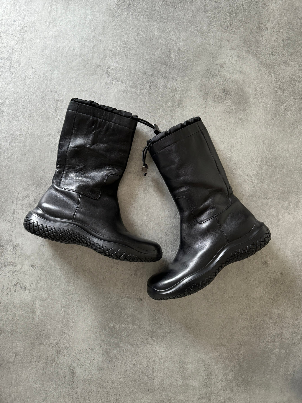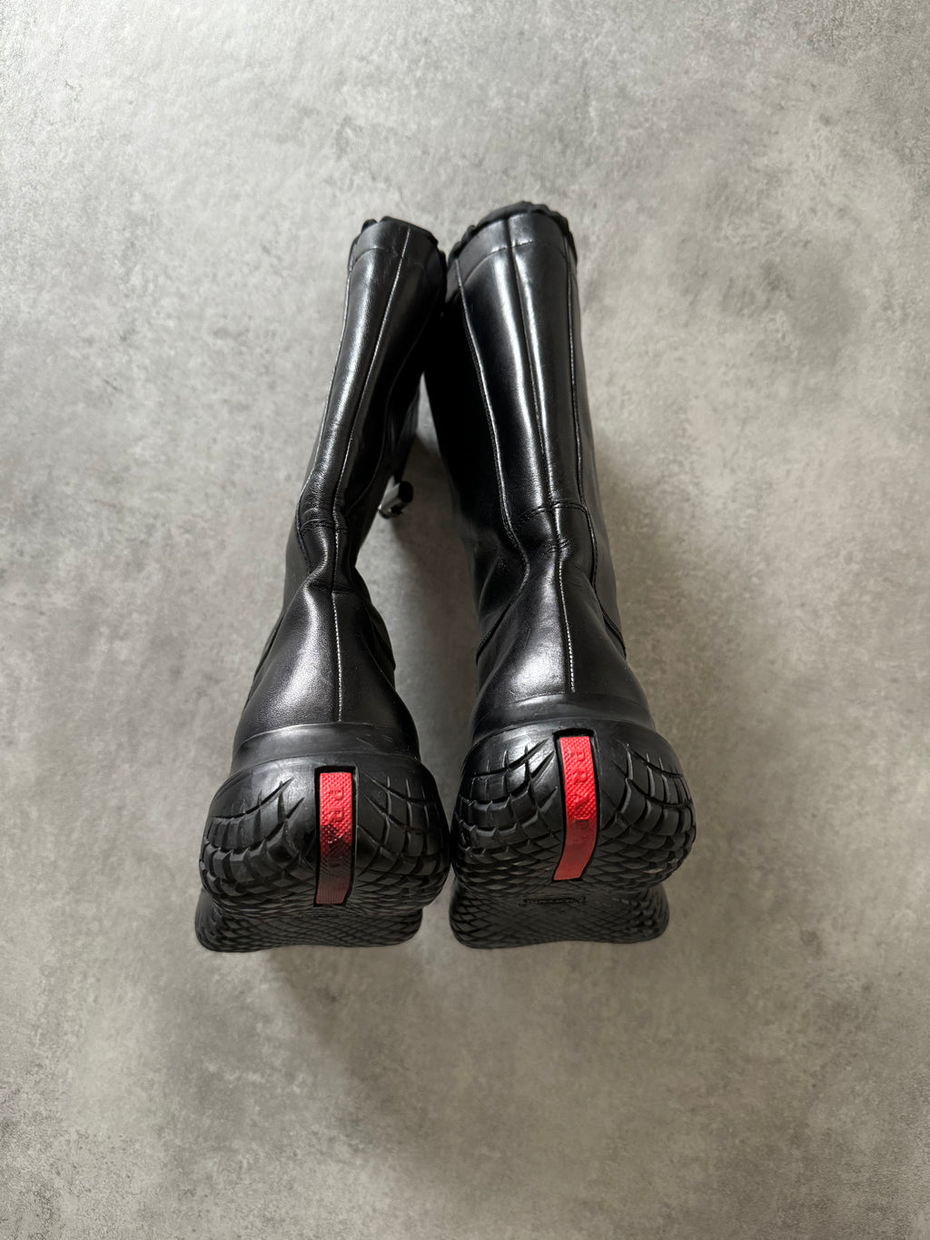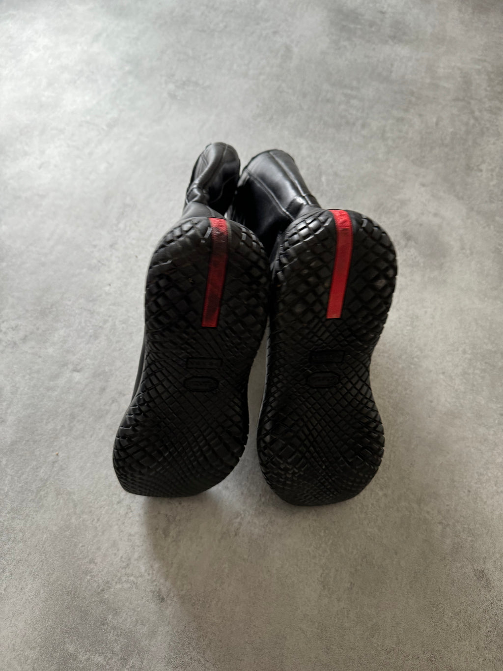 In 1999, Prada introduced an avant-garde leather boots. Its minimalist shape is very well crafted with a thick Vibram sole. An elastic band allows the boot to be easily put on.The leather is a deep black. Its futuristic look is sublime and easily wearable with all types of bottoms.