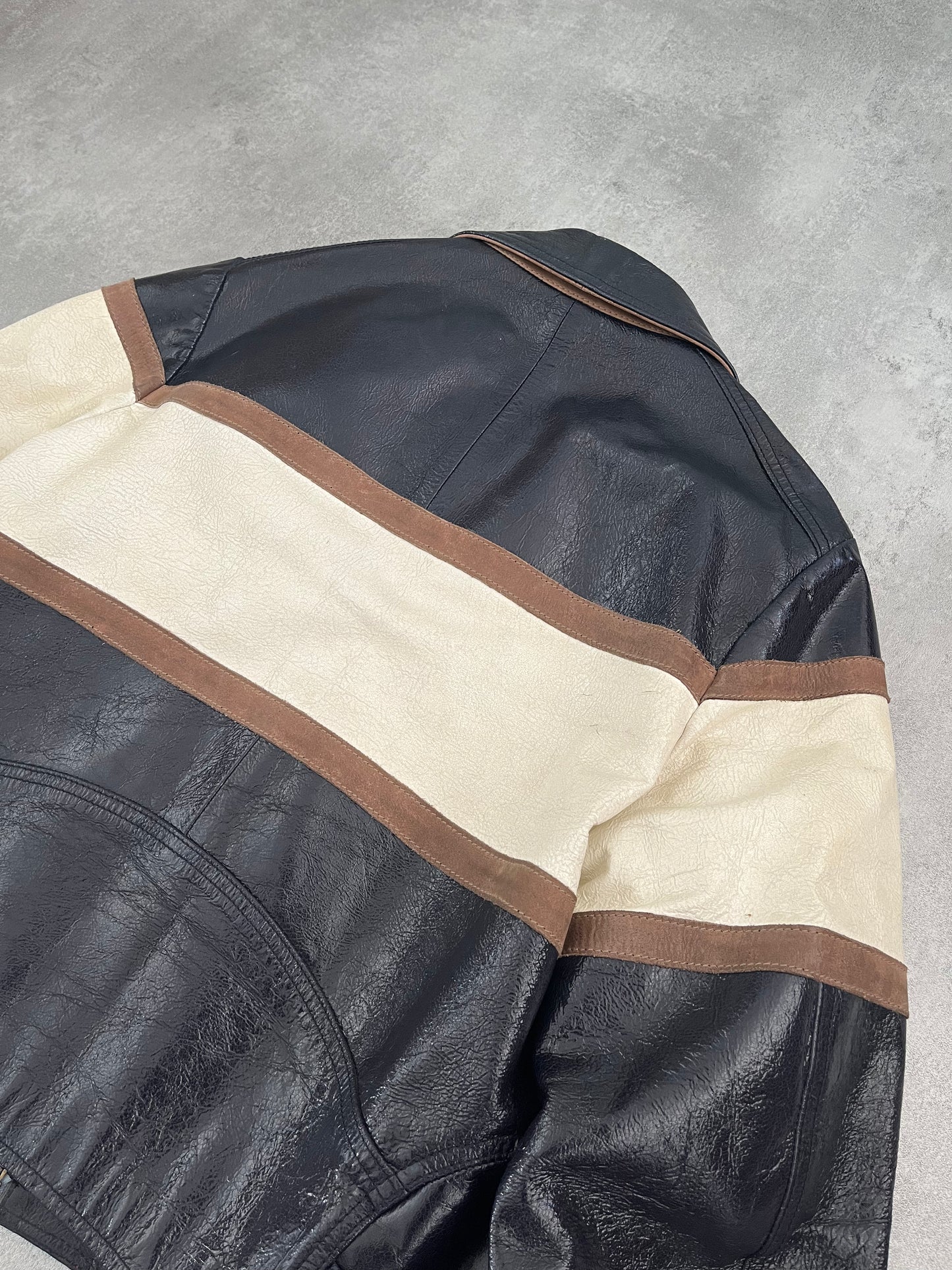 Still in a great overall condition. On the front torso, some of the white leather has aged quite a bit, and on the back the leather is a little cracked in places, but overall the jacket is in good condition.
