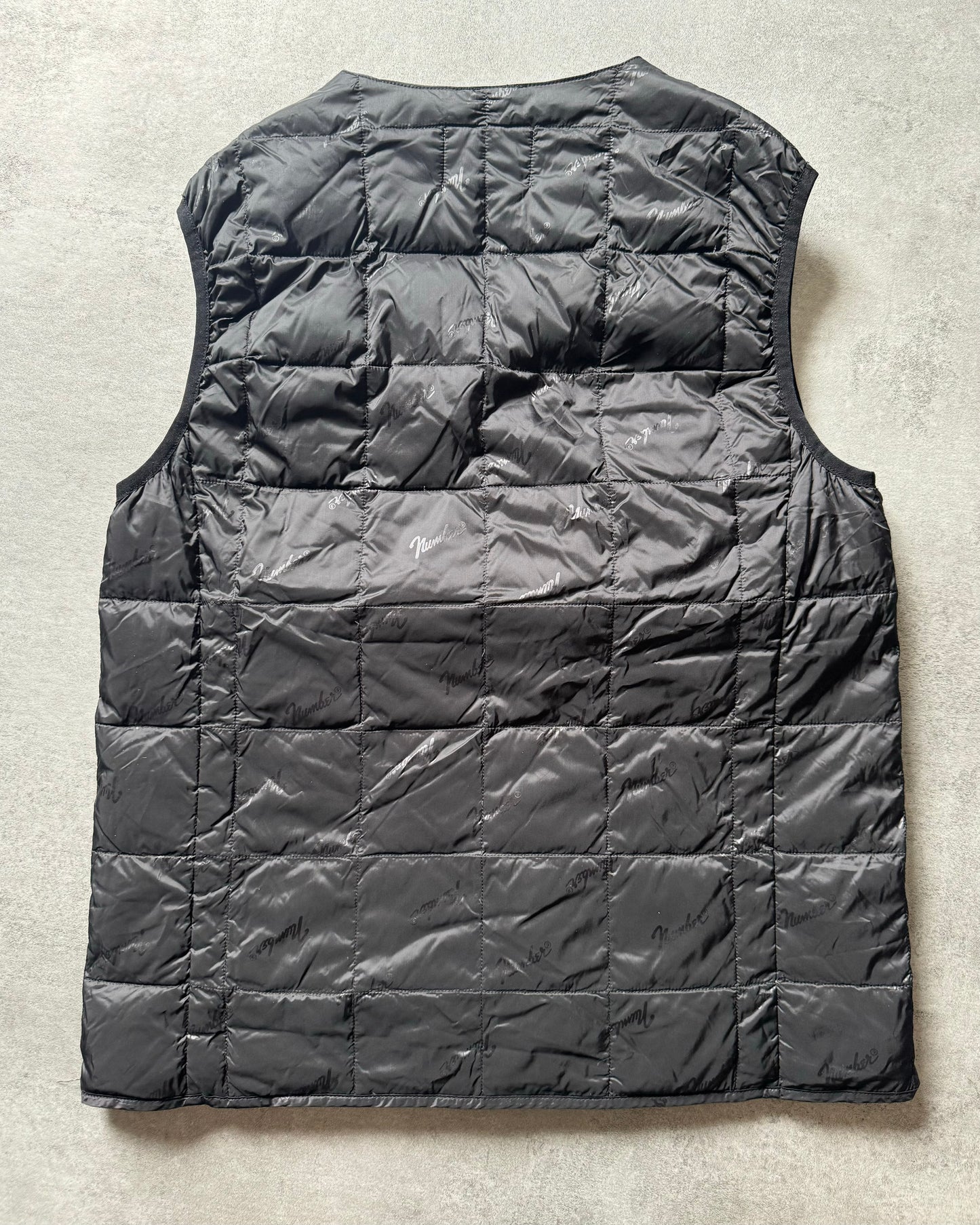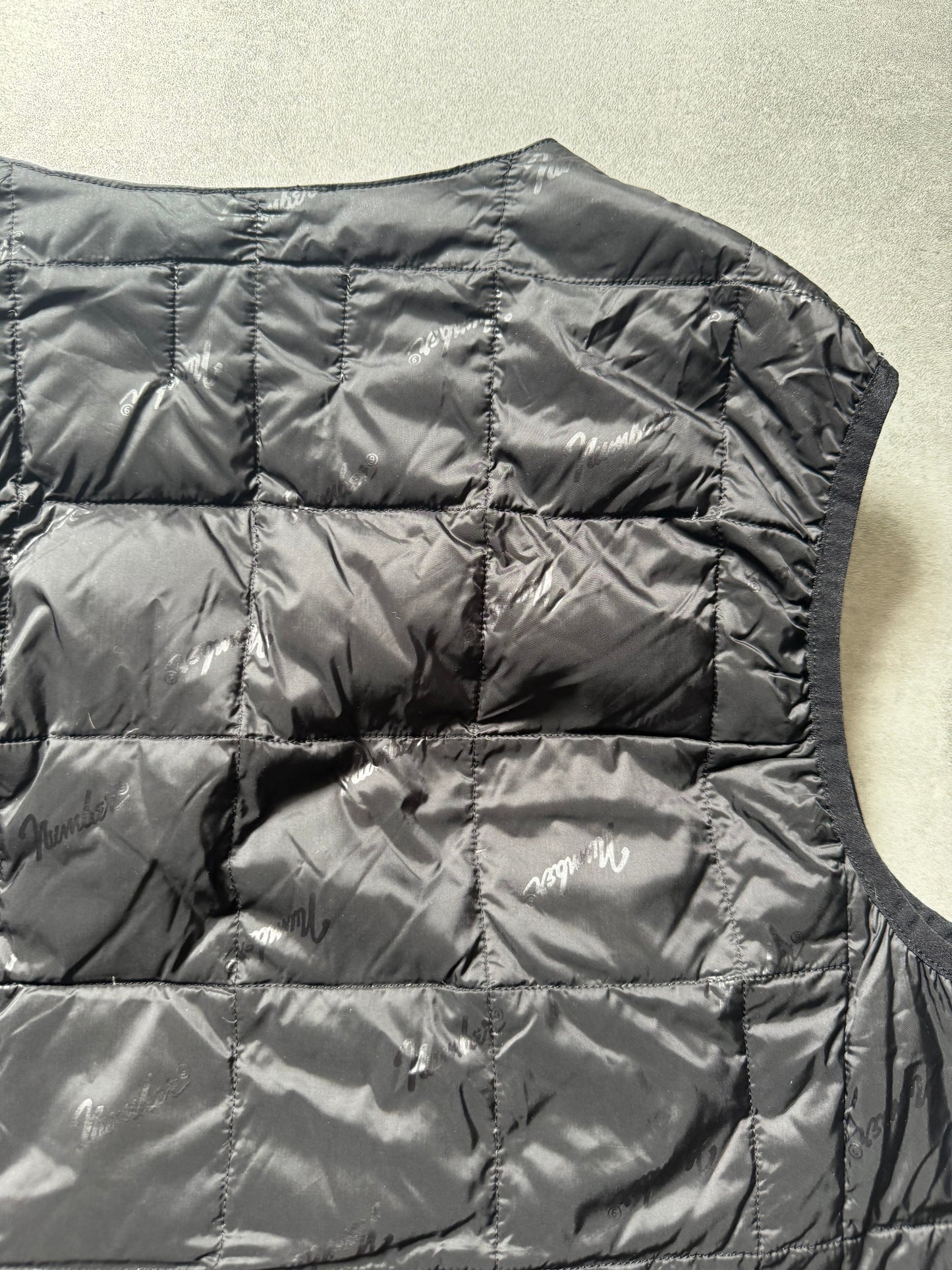 Introducing the Autumn/Winter 2007 Number (N)ine Black Sleeveless Jacket, a distinctive piece from Takahiro Miyashita's renowned brand. This jacket epitomizes the avant-garde aesthetics and meticulous craftsmanship that Number (N)ine is celebrated for. Still in a great overall condition