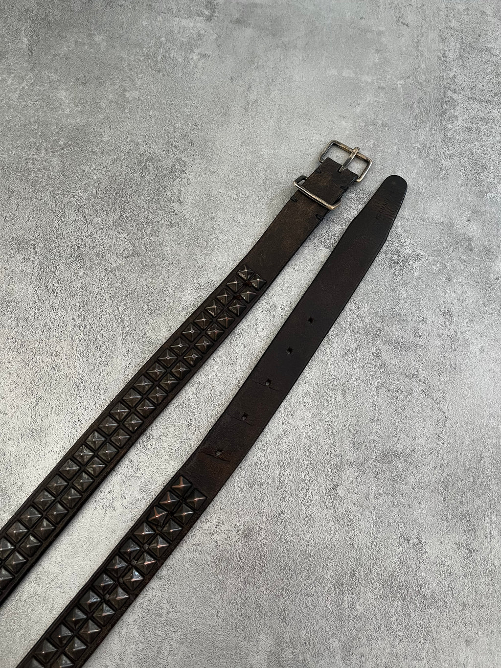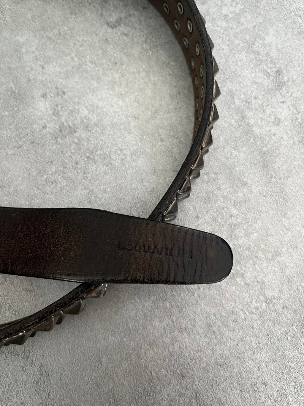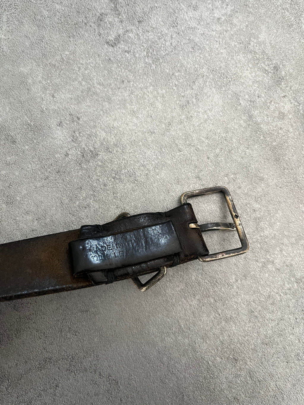 Dsquared2 Combat Retro Leather Belt The belt's retro charm makes it a versatile accessory that effortlessly complements both casual and formal ensembles. Whether paired with jeans for a laid-back vibe or cinched around a tailored dress for a sophisticated touch, this belt adds a retro twist to any look. Similar spirit than the famous FW2010 Balmain Bullet belt. Still in a great overall condition Unisexe: 121,5cm x 3cm