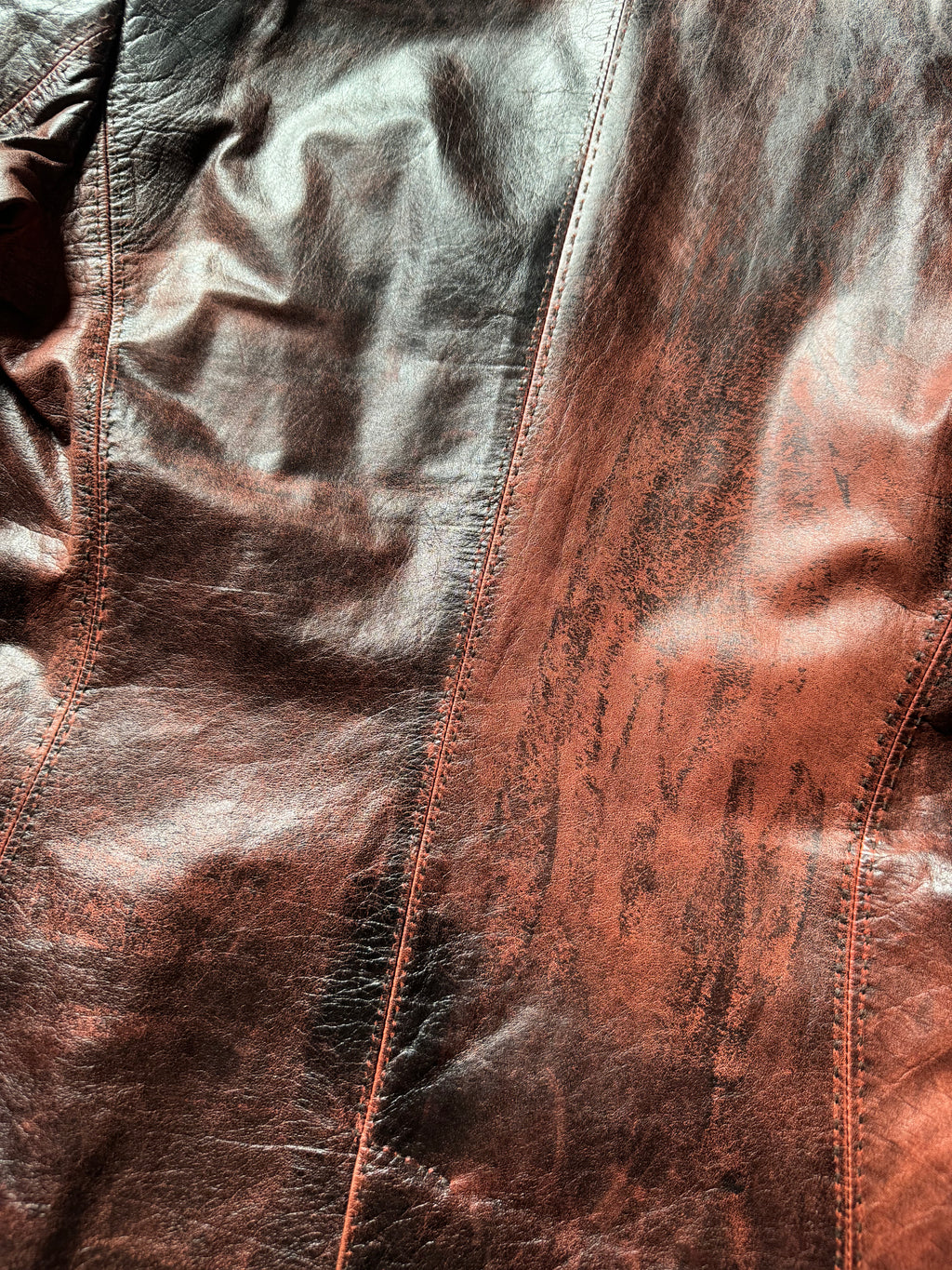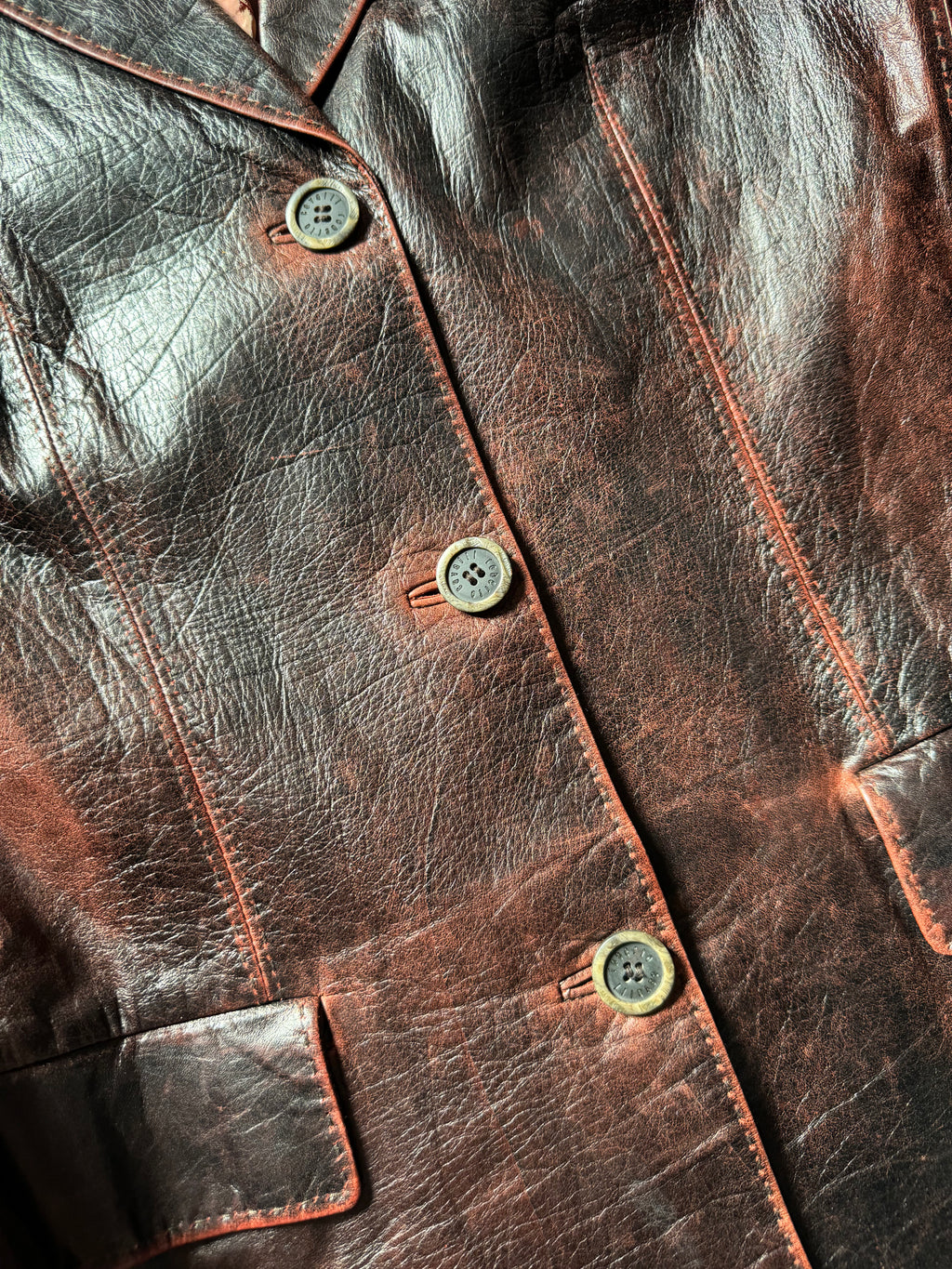 Presenting the FW1999 Roberto Cavalli Eroded Genuine Leather Suit Jacket, an extraordinary piece from the iconic Italian designer. This jacket is a prime example of Cavalli's unique approach to fashion, merging bold creativity with luxurious materials. Crafted from genuine leather, this suit jacket features a distinct eroded texture that gives it an edgy, rugged appearance while maintaining a sophisticated silhouette. The meticulous craftsmanship highlights the designer's attention to detail and his innovative use of materials. Still in excellent condition, worn a few times only.