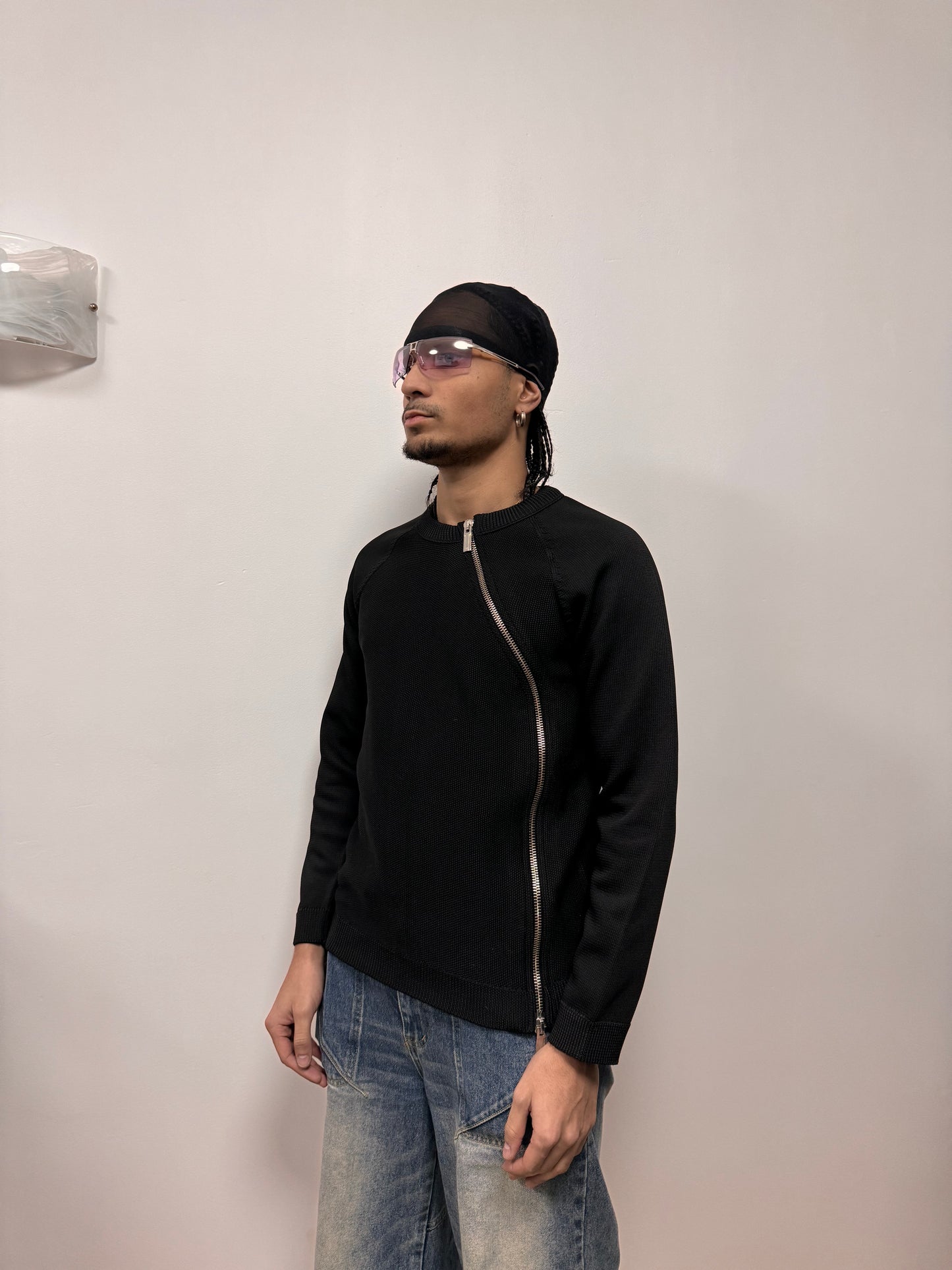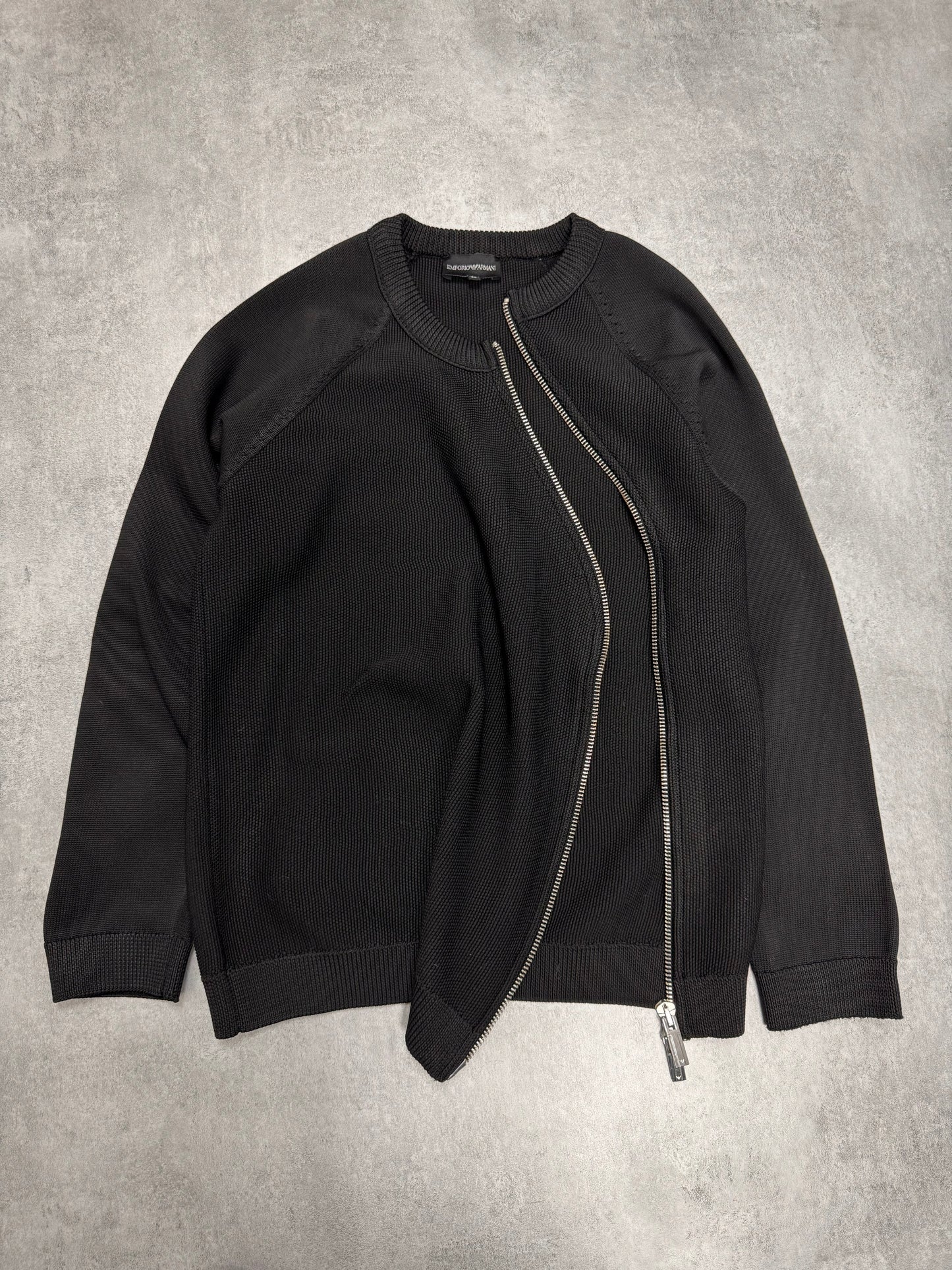 Armani black cotton asymmetrical zip sweater from 2015 Fall/Winter collection. Bold and minimalist design. Perfect condition. Made in Italy, Size 50. Please refer to measurements.