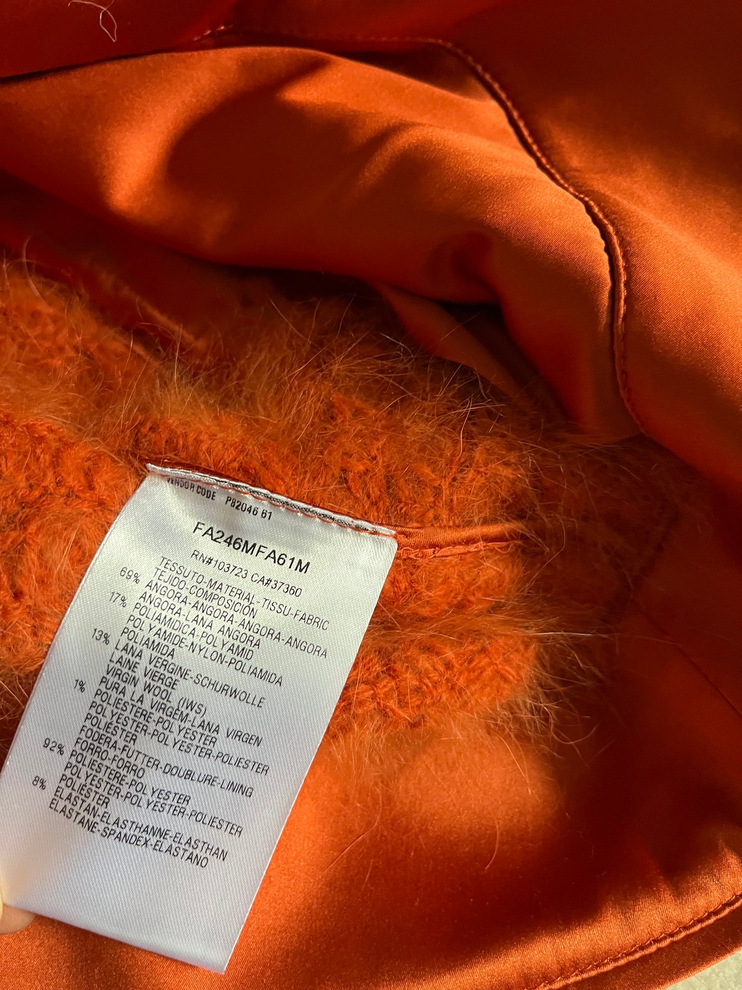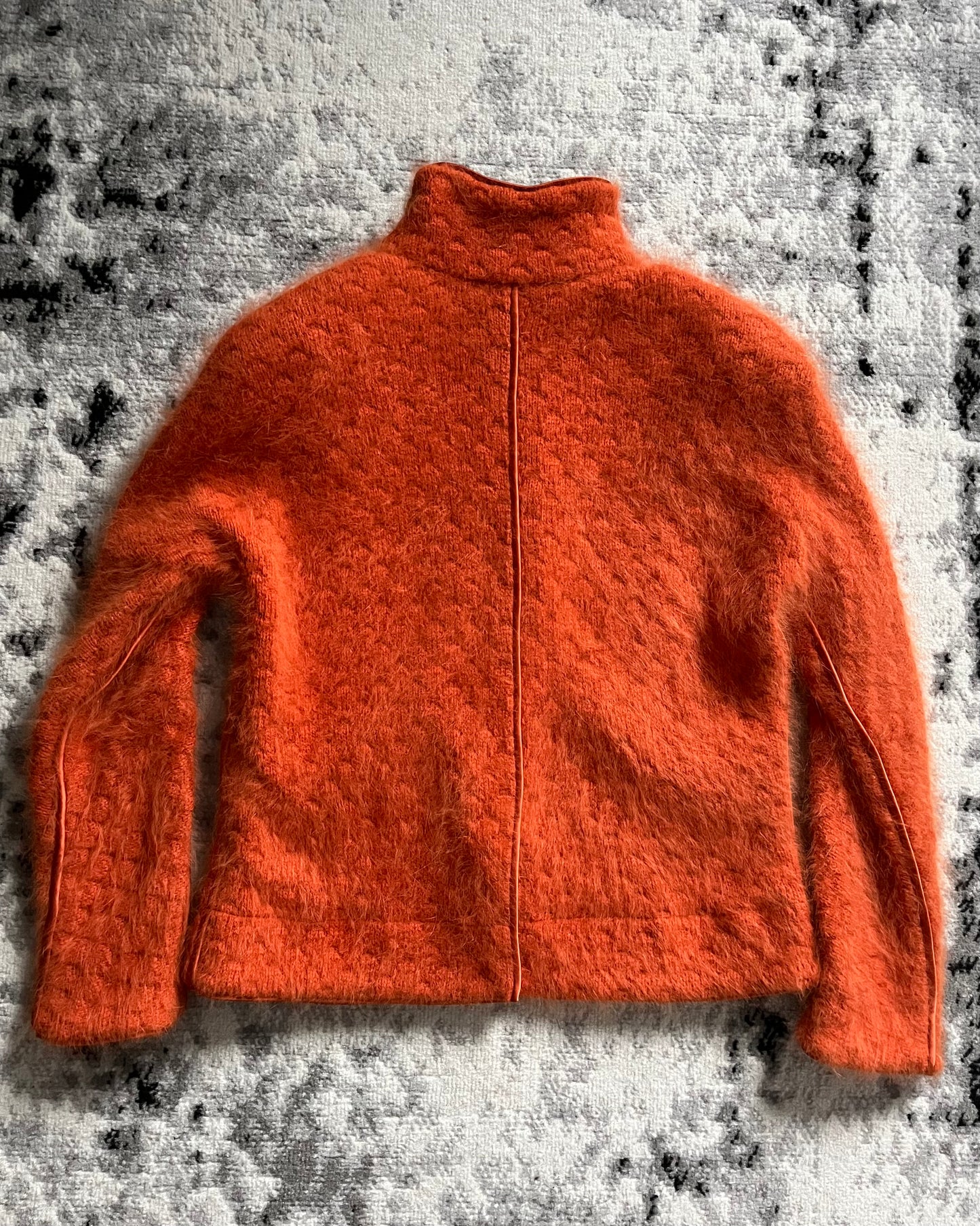 Giorgio Armani is known for his timeless and elegant designs, often characterized by clean lines, luxurious fabrics, and a sophisticated color palette such as this unique orange. This avant-garde cardigan seamlessly fuses Giorgio Armani's signature sophistication with innovative design elements. The clean lines and luxurious craftsmanship characteristic of Armani are juxtaposed with avant-garde details, creating a garment that stands out as a modern style statement.