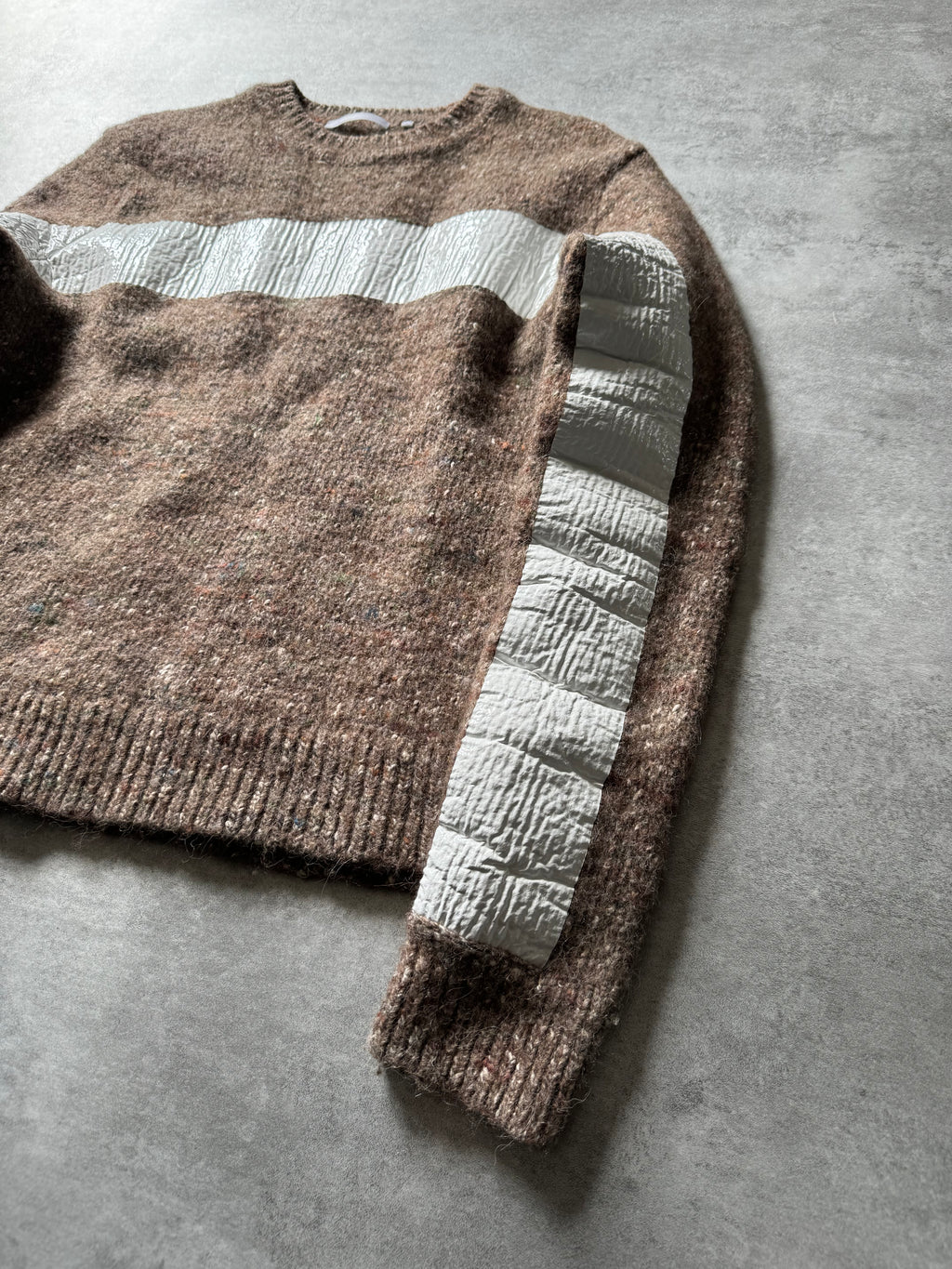 Crafted from premium wool, this sweater features a unique painted design that adds an artistic flair to the classic knitwear silhouette. The white painted line spanning from one arm to the other creates a striking visual effect, drawing the eye and adding interest to the otherwise simple design.