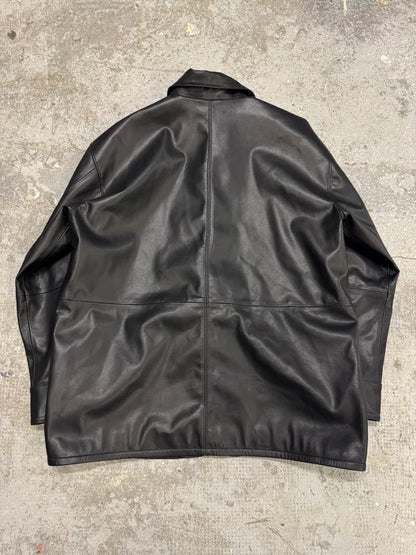 The Levi's Black Bovine Leather Shirt features premium bovine leather, exuding a classic yet contemporary vibe. Its sleek black hue is accented by meticulous stitching and subtle details, ensuring it stands out in any wardrobe. Designed for versatility, it seamlessly transitions from casual outings to more polished events. In good condition. Marked size S, it is perfect for men looking to elevate their fashion game.