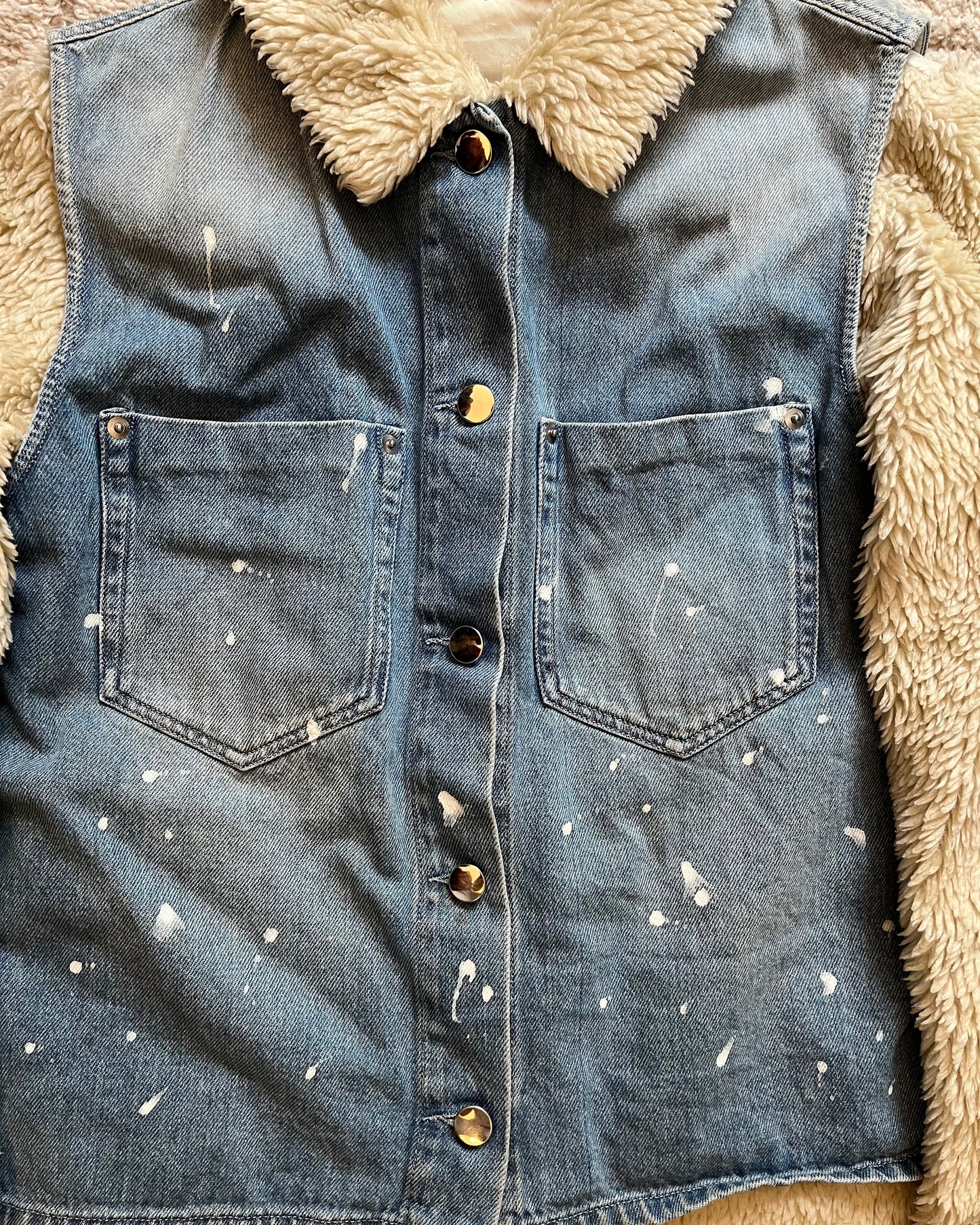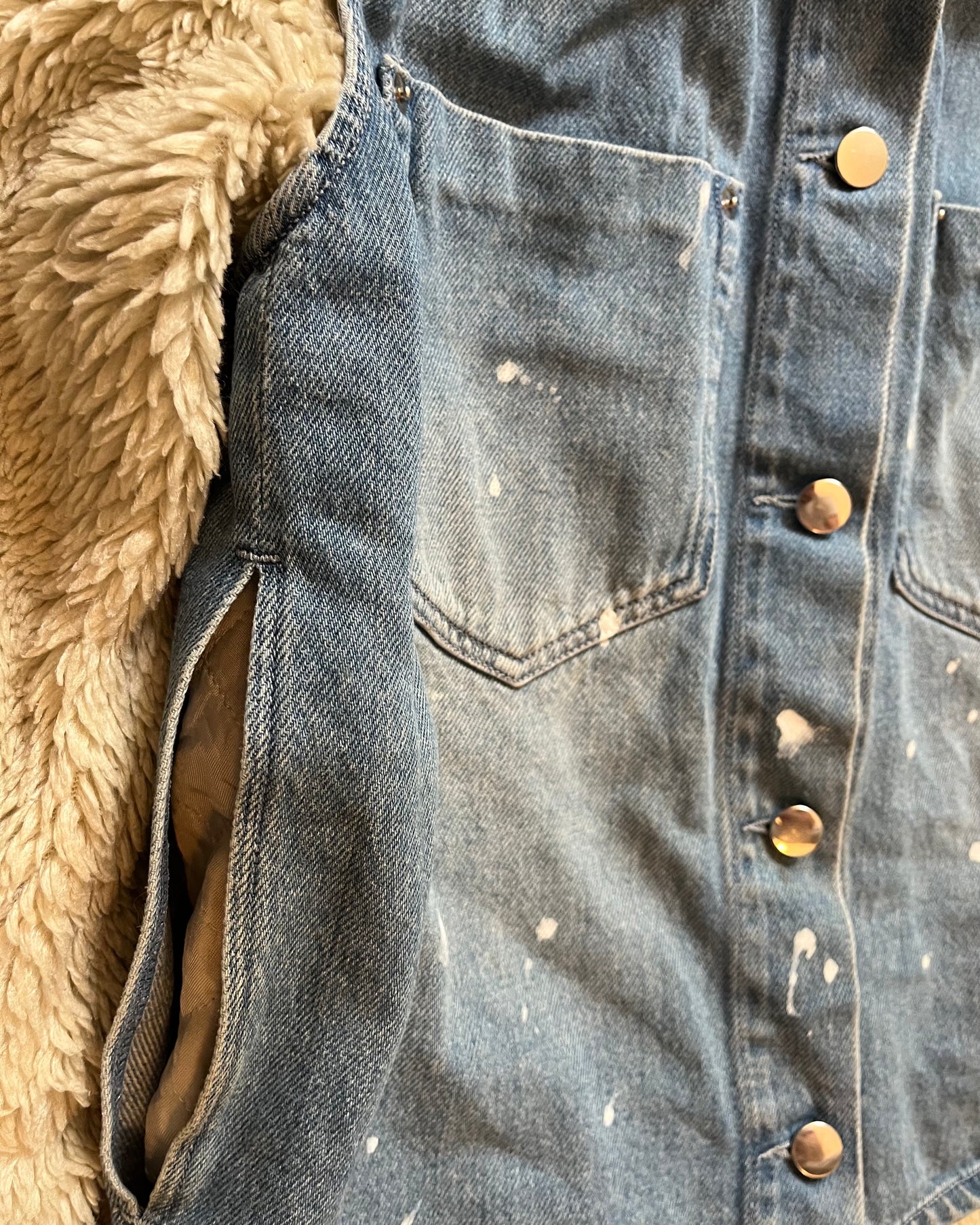 Underneath the fur layer lies a small denim vest without sleeves, adding a contemporary twist to the overall design. The denim vest brings a rebellious and youthful vibe to the jacket, allowing for versatile styling options. Whether you choose to wear them together for a bold and statement-making look or separately to create different outfits, this 2-in-1 jacket offers endless possibilities.