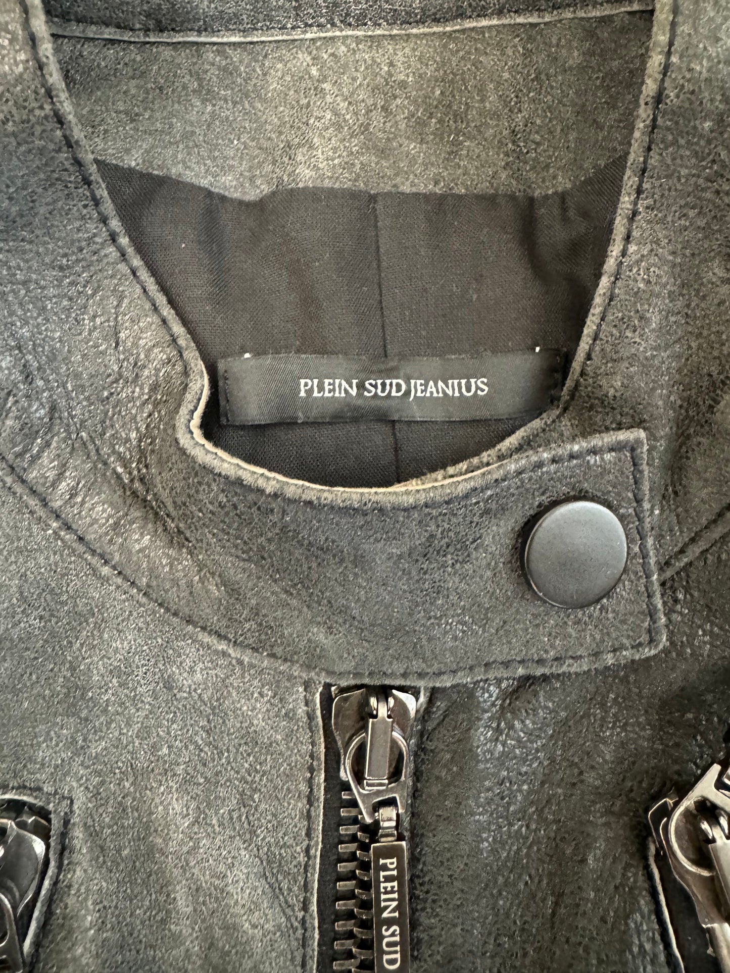 This Plein Sud jacket has the same silhouette as the famous Maison Margiela 5-Zip jacket. However, it contains more detail such as patches on the elbows and at the trapezes. Its faded/eroded appearance gives it a vintage side and adds charm and history.