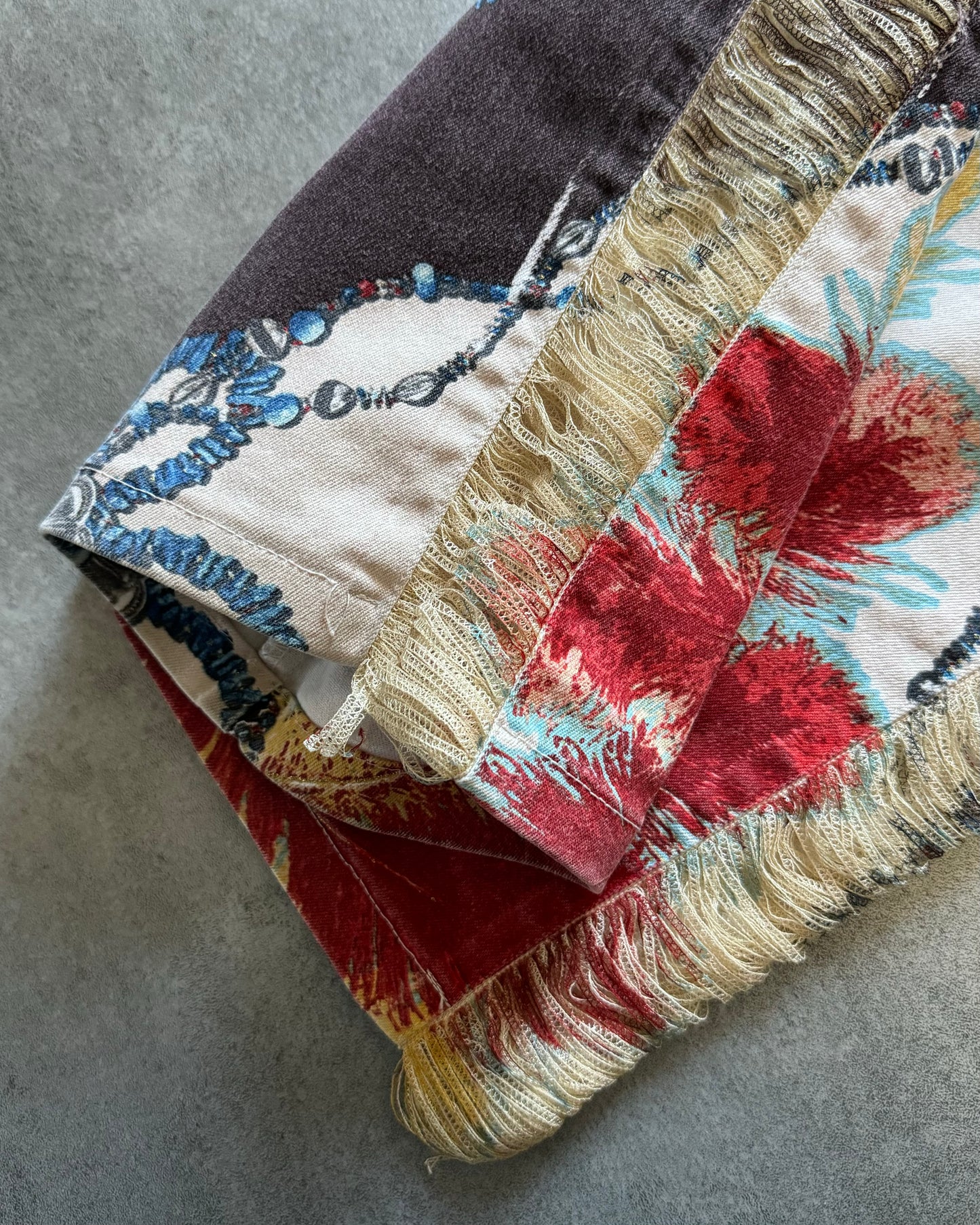 SS2000 Roberto Cavalli Sample Spring Relaxed Flowers Pants. Adorned with an array of vibrant floral motifs, these pants evoke the beauty and energy of a blooming garden in full bloom. The relaxed silhouette and lightweight fabric ensure comfort and ease of movement, making them the perfect choice for embracing the warmer months in style. Extremely rare item, it was made by hand on the side opening. A truly exceptional piece. Still in a very great overall condition. Waist - 34cm / Length - 96cm / Leg Opening - 20.5cm
