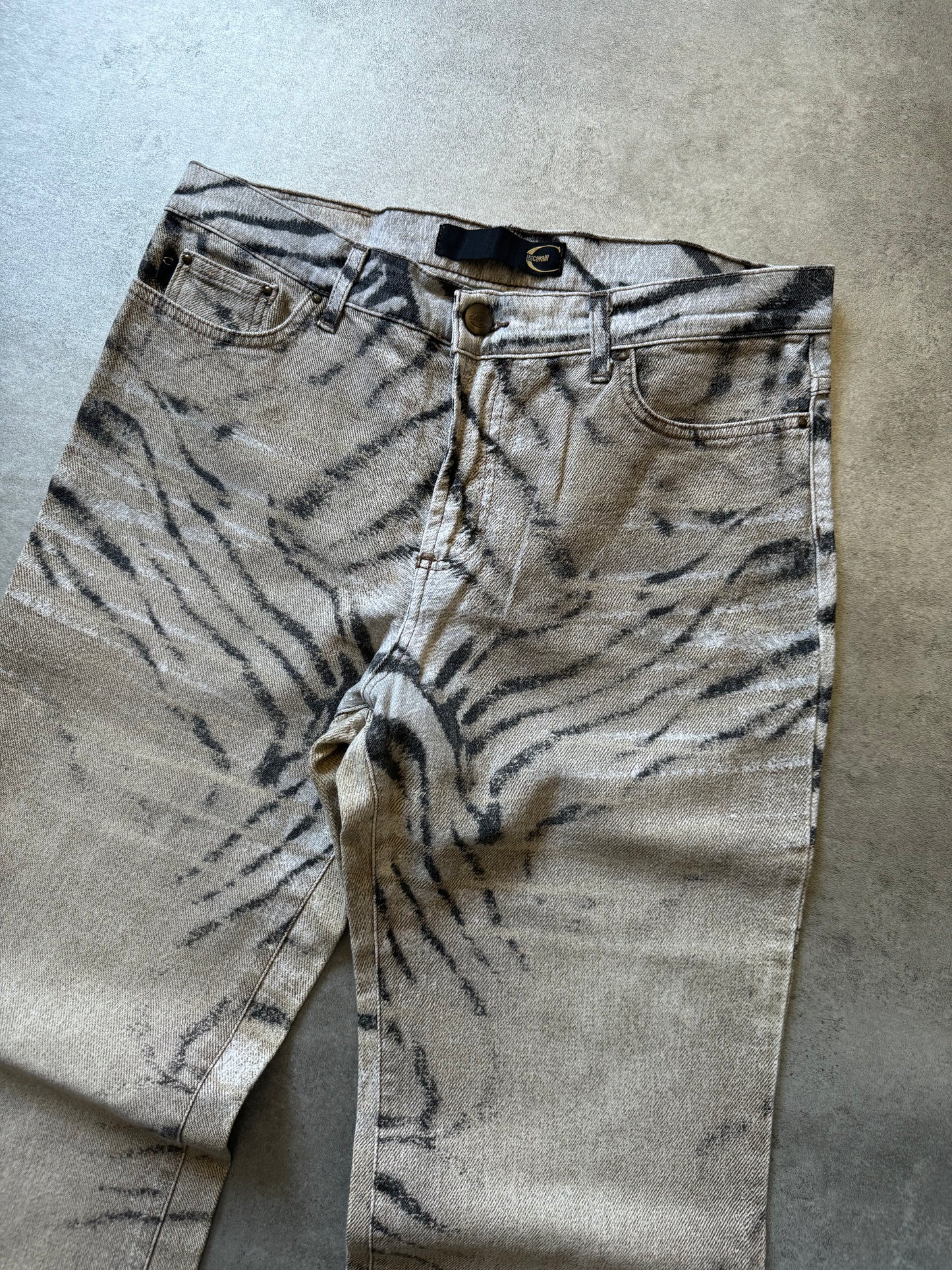 SS2002 Cavalli Zebra Camel Faded Pants. Roberto Cavalli is an Italian fashion designer known for bold and extravagant designs. These zebra print pants are a rare colorway from the 2000s animal print trend.