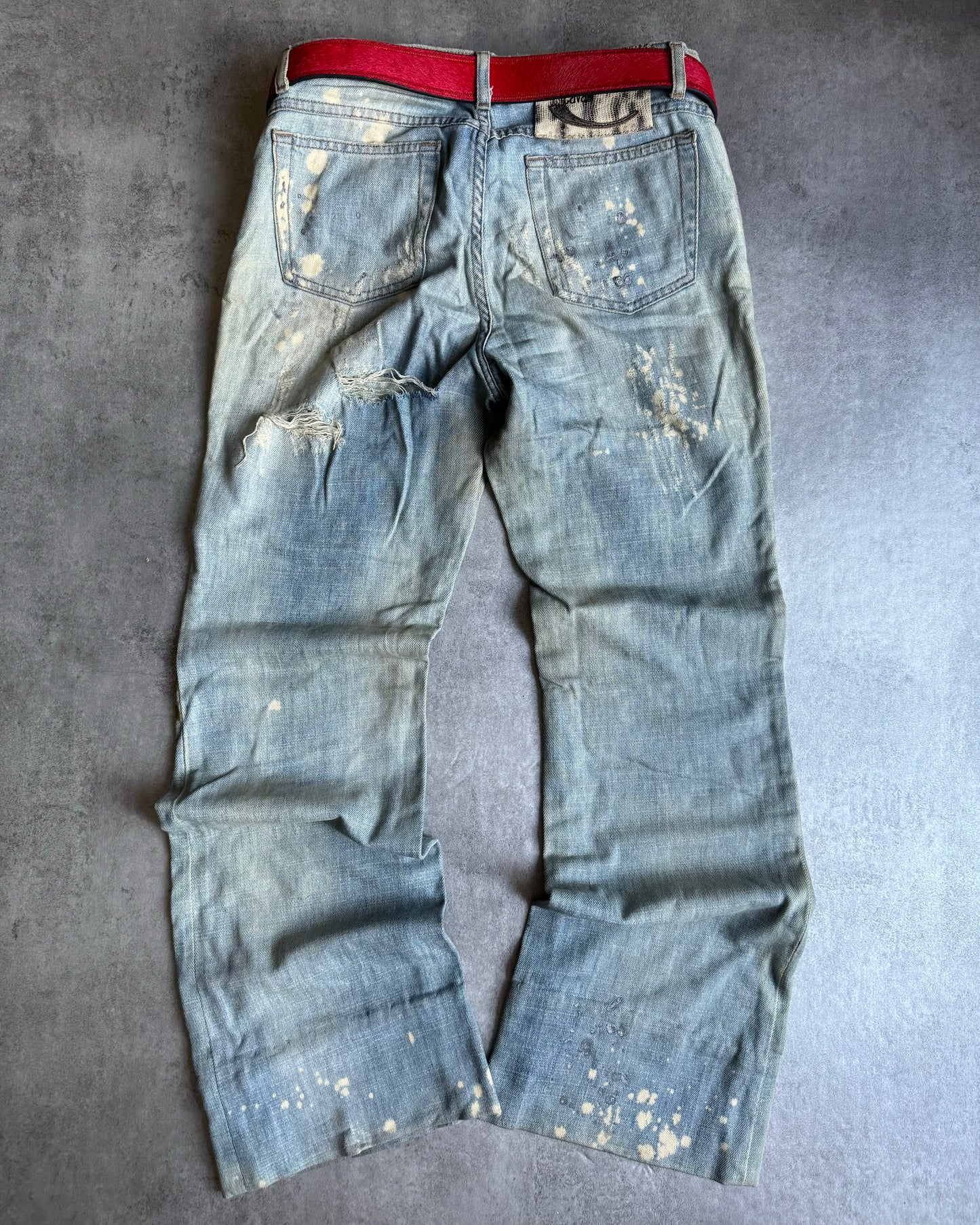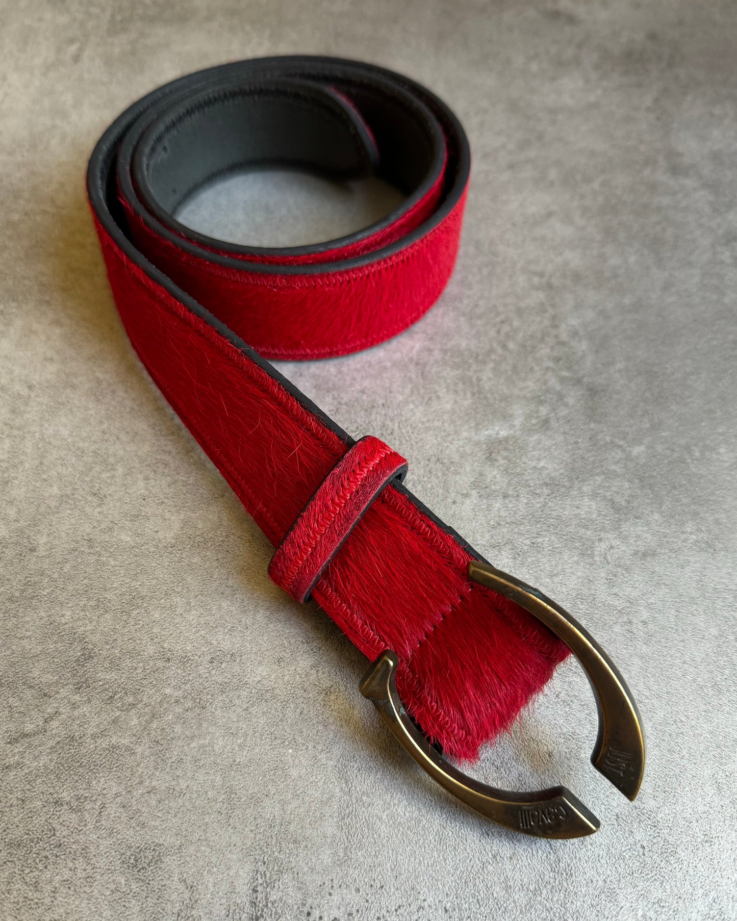 SS2004 Cavalli Red Pony Hair Leather Belt The deep red hue is both bold and sophisticated, making it a statement piece that can elevate any outfit. The pony hair finish adds a luxurious and exotic touch, while the leather base ensures durability and structure. Excellent condition. Fits great for a men, not too large at the waist.