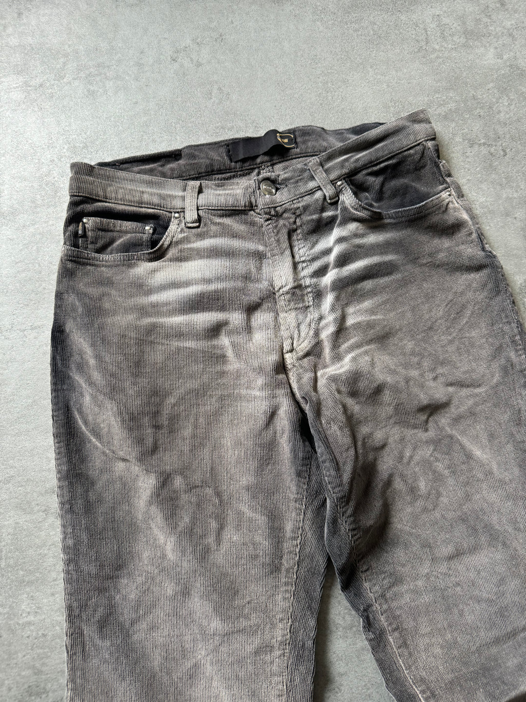 SS2004 Cavalli Velvet Grey Pants. The SS2004 Cavalli Velvet Grey Pants are a luxurious addition to any wardrobe, offering a stylish and comfortable option that captures the essence of Roberto Cavalli's iconic fashion. Still in a great overall condition