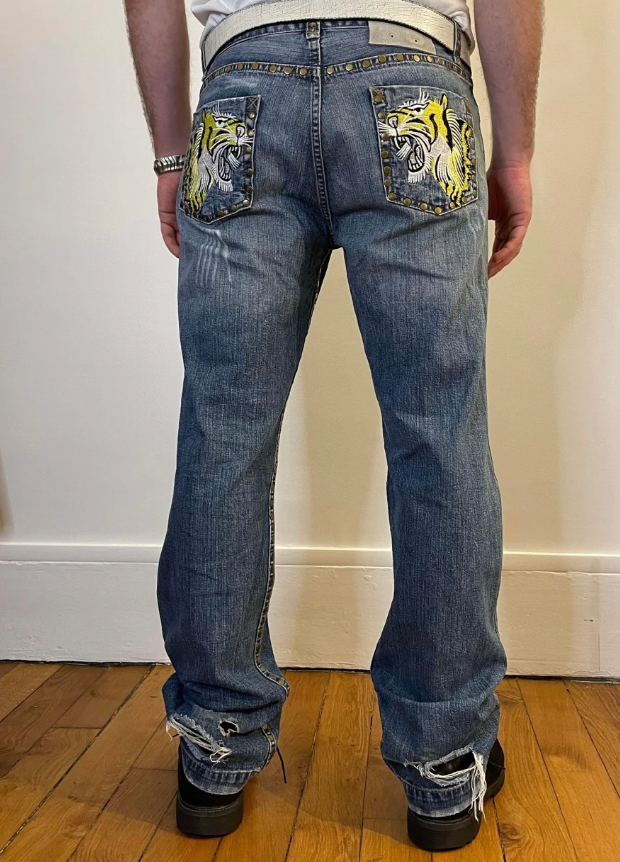 Introducing the coveted 00s Dolce & Gabbana distressed embroidered tiger jeans. These jeans feature an intricately embroidered tiger on the back pockets, adding a unique touch to the distressed denim. Crafted from high-quality denim, these jeans are designed to look and feel like your favorite worn-in pair. The distressed detailing adds a vintage vibe to the jeans, while the tiger embroidery adds a modern and edgy twist. These Dolce & Gabbana jeans have a flattering fit, with a mid-rise waist and a large-leg silhouette. They're versatile enough to be dressed up or down, making them perfect for any occasion. The attention to detail on these jeans is unmatched, with the embroidered tiger serving as the standout feature. Also, the detail of the nails on the inner part of the legs is exceptional, it makes an underground spirit and very unique to D&G. Still in a very great overall condition. Please refer to measurements. Length - 107cm. Waist - 42cm. Leg Opening - 22cm.