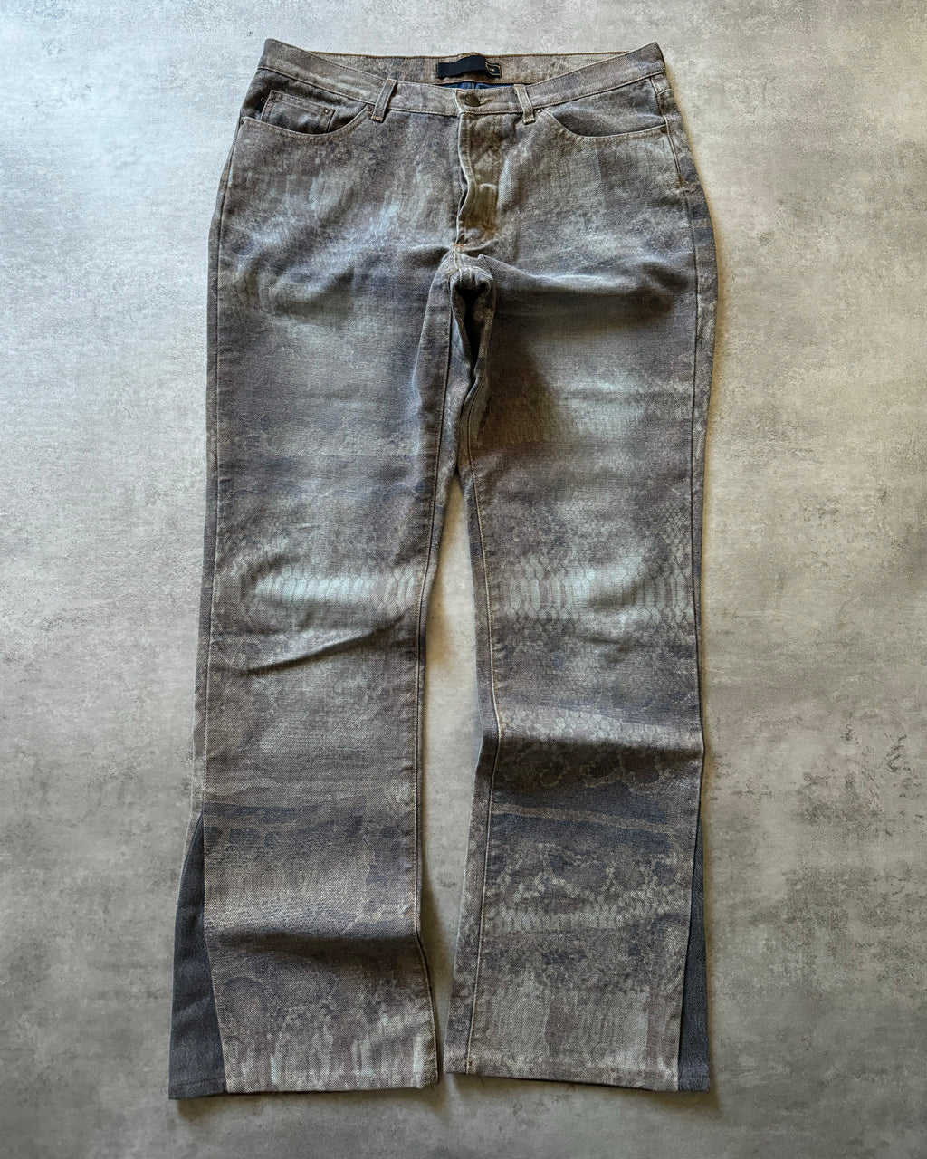 The standout feature of these jeans is the alluring python pattern that adorns the fabric. The sinuous and elegant lines of the python weave their way across the jeans, adding a touch of exotic luxury to the overall design. The snake's hypnotic allure, paired with the faded colorway, creates a captivating visual effect that is both alluring and unforgettable.