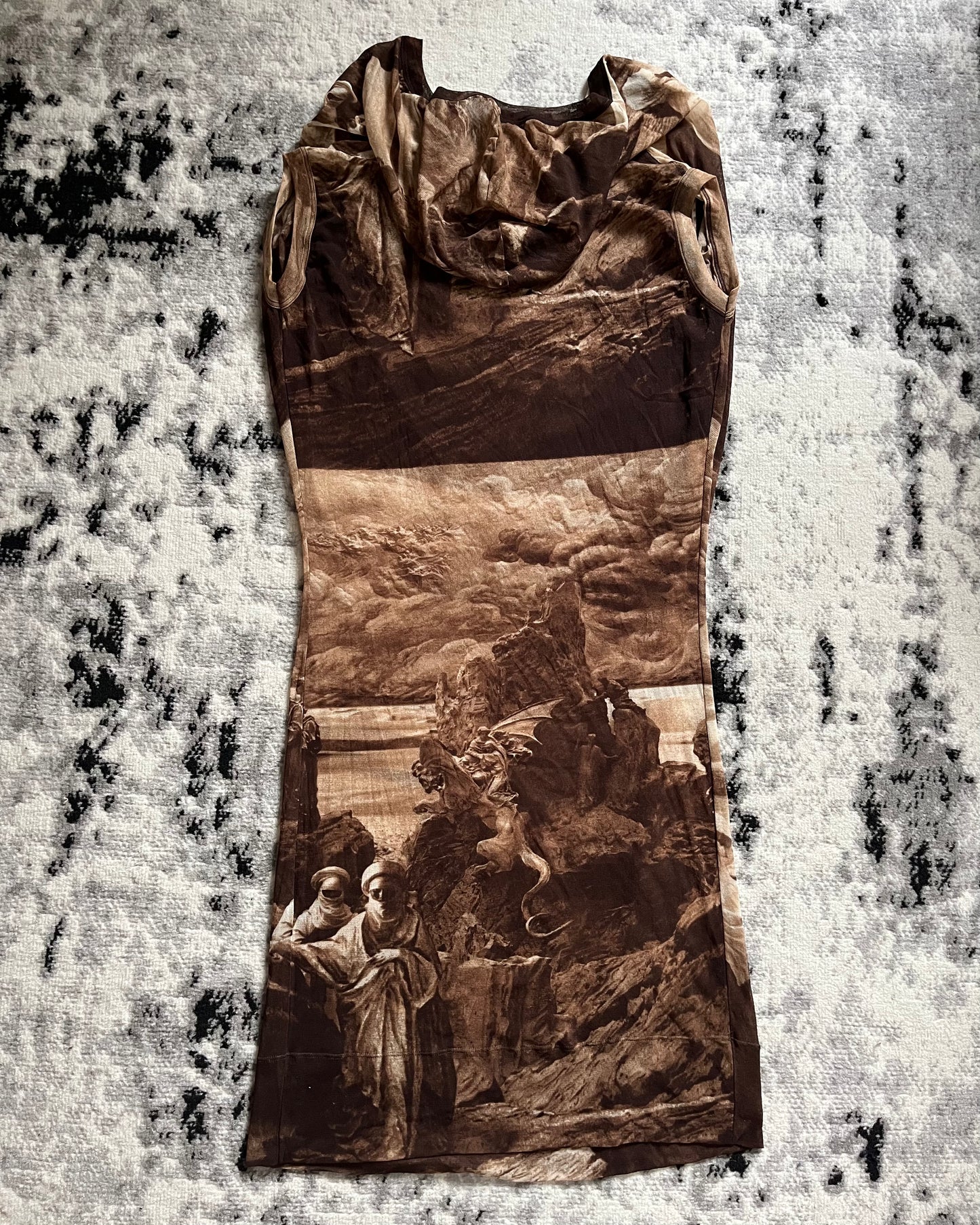 Dive into a world where history and fashion converge with the 'Jean Paul Gaultier Bedouin-Inspired Hooded Dress.' Throughout the 90s and early 2000s, Jean Paul Gaultier had a remarkable talent for breathing new life into historical references, creating timeless designs using luxurious fabrics. This exceptional dress draws its inspiration from the Bedouin people, a nomadic Arab tribe known for their fierce independence, enchanting oral poetry, and captivating sword dances. This dress beautifully encapsulates their rich culture and way of life. What sets this dress apart is the hood, a distinctive feature that harks back to the nomadic lifestyle and adds an air of mystery to the attire. Just like the Bedouin culture itself, this dress's beauty is timeless, transcending eras and trends, making it a versatile and enduring piece. Crafted by one of the world's most renowned fashion designers, this dress is a testament to Gaultier's commitment to pushing the boundaries of fashion. Extremely rare item, still in a decent condition. PLEASE REFER TO MEASUREMENTS. Hollow to bust - 98cm. This dress, made of 100% polyamide, is very elastic and can be adapted to many body types.